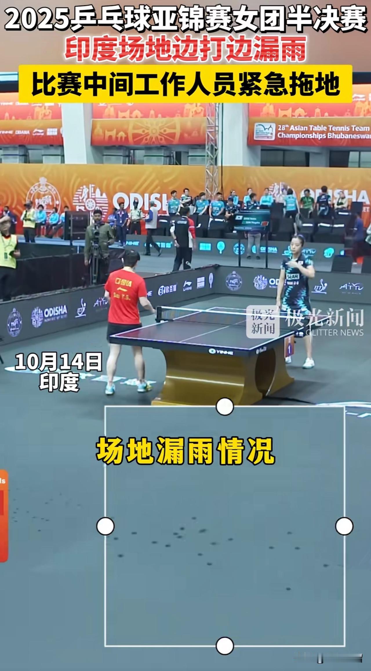 这事太尴尬了,不光中国人民知道了,全世界人民都知道了。 印度这次可真是把脸都丢尽了。 在印度举办的乒乓球亚锦赛女团半决赛中,中国队与韩国队交锋。孙颖莎上场时,场地上竟出现一连串水滴,比赛被迫暂停,运动员只能在一旁尴尬等候。谁能想到,比赛进行到一半,几名工作人员又跑来使劲拖地。仔细一瞧,原来是运动场漏水,致使比赛多次中断,实在尴尬至极。 这次印度乒乓球亚锦赛,真的是令人一言难尽。男团国乒对阵伊朗的比赛,现场竟突然出现无人机;国乒训练时,王曼昱遭遇“天降鸟屎”,王楚钦在练球时,甚至场馆出现了青蛙……总之,没有最尴尬,只有更尴尬,这次印度亚锦赛的糗事一桩接一桩。 没条件举办就别办,既然要办,就该好好筹备。啥都没准备好,状况不断,这下可真是在全世界面前出尽了洋相。 (图片来源网络)