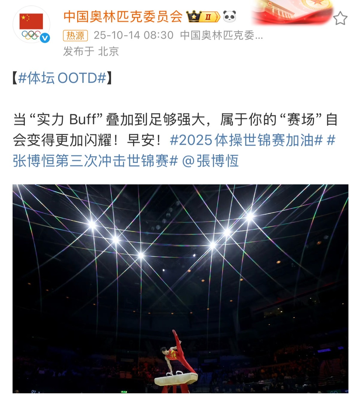 中国奥委会祝福张博恒今天早上中国奥林匹克委员会官方微博发文祝福出征2025年雅加达体操世锦赛的张博恒:“当“实力 Buff”叠加到足够强大,属于你的“赛场”自会变得更加闪耀!早安!”