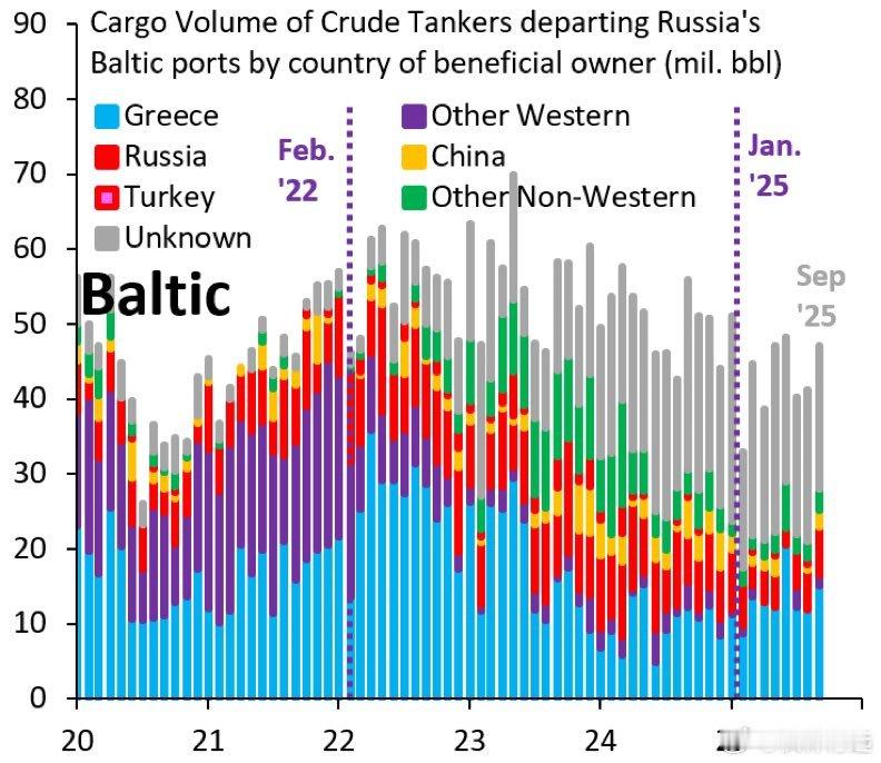 2、欧盟和英国在2025年对大量影子舰队船只实施了制裁。问题在于,这些船只大多无视制裁,畅通无阻地航行。影子舰队(灰色)目前约占俄罗斯经波罗的海海运石油出口的一半。