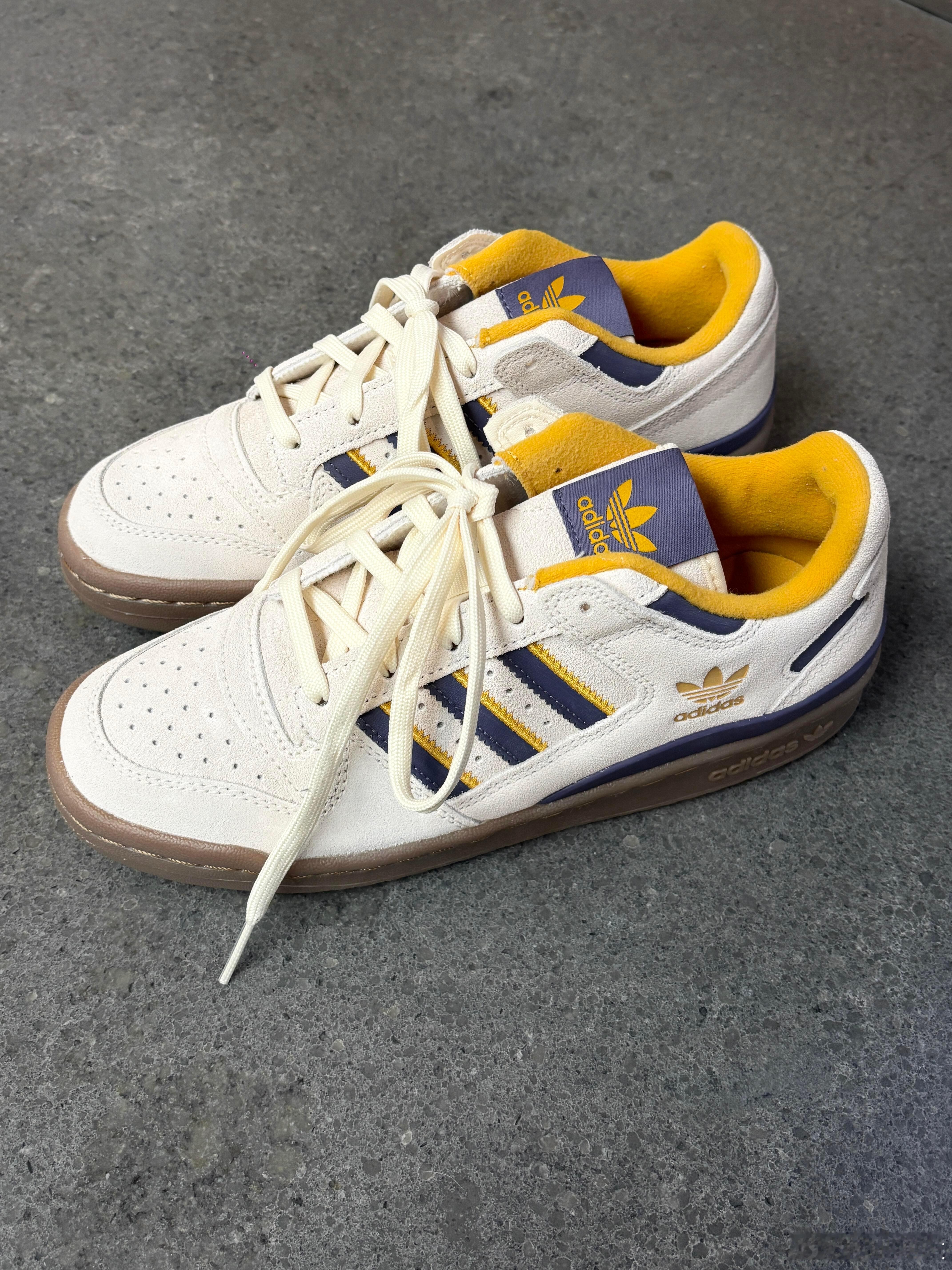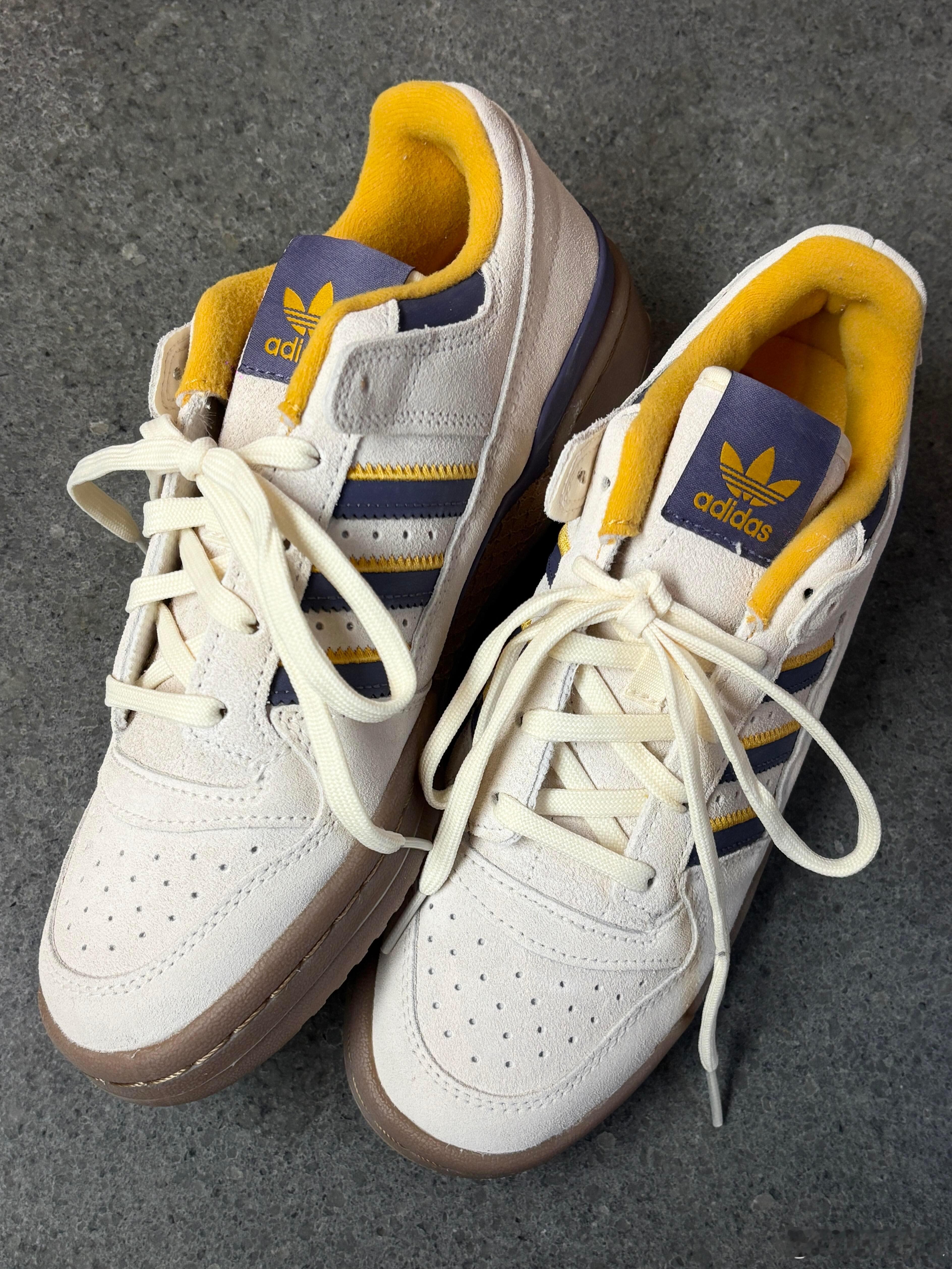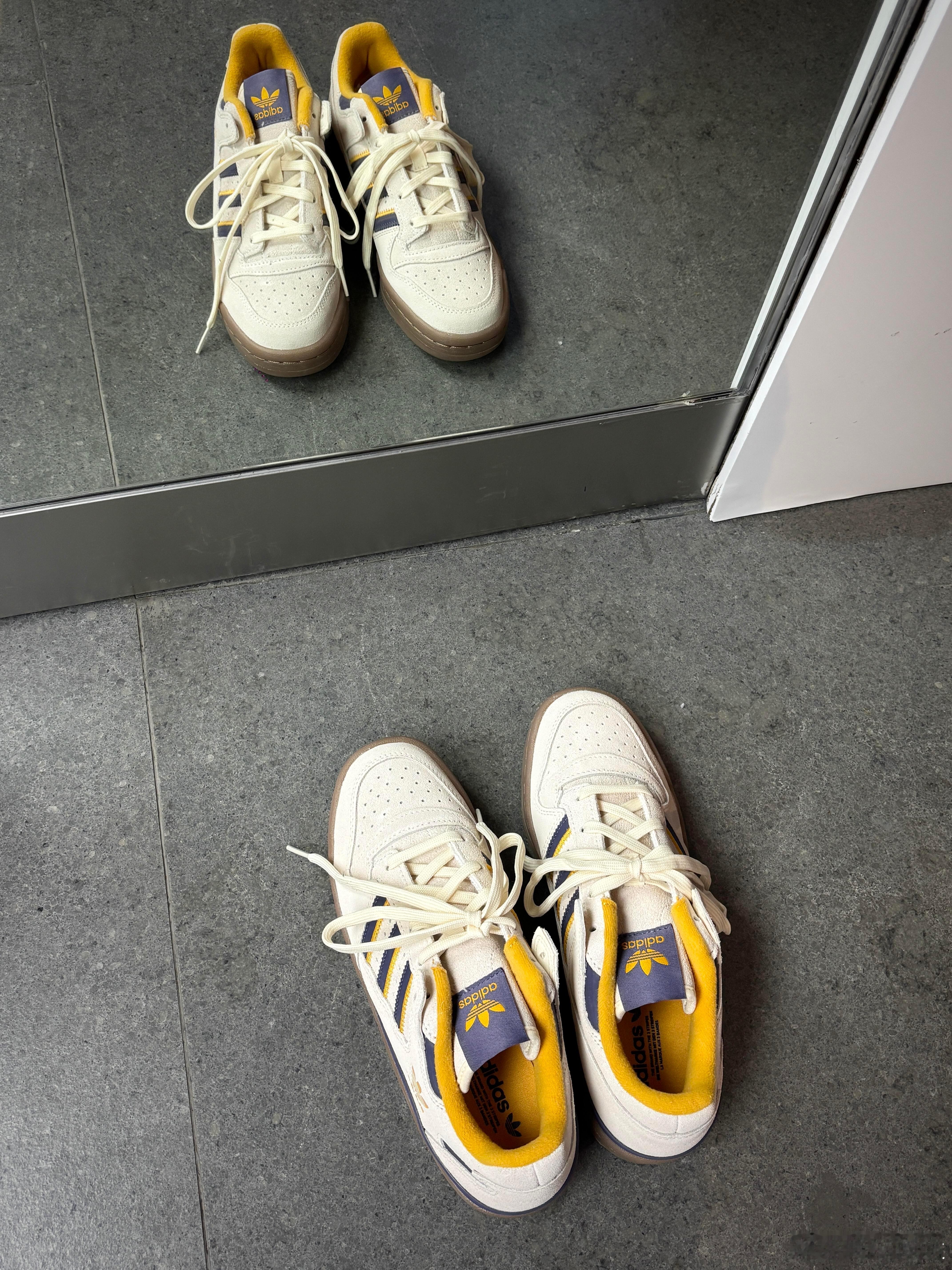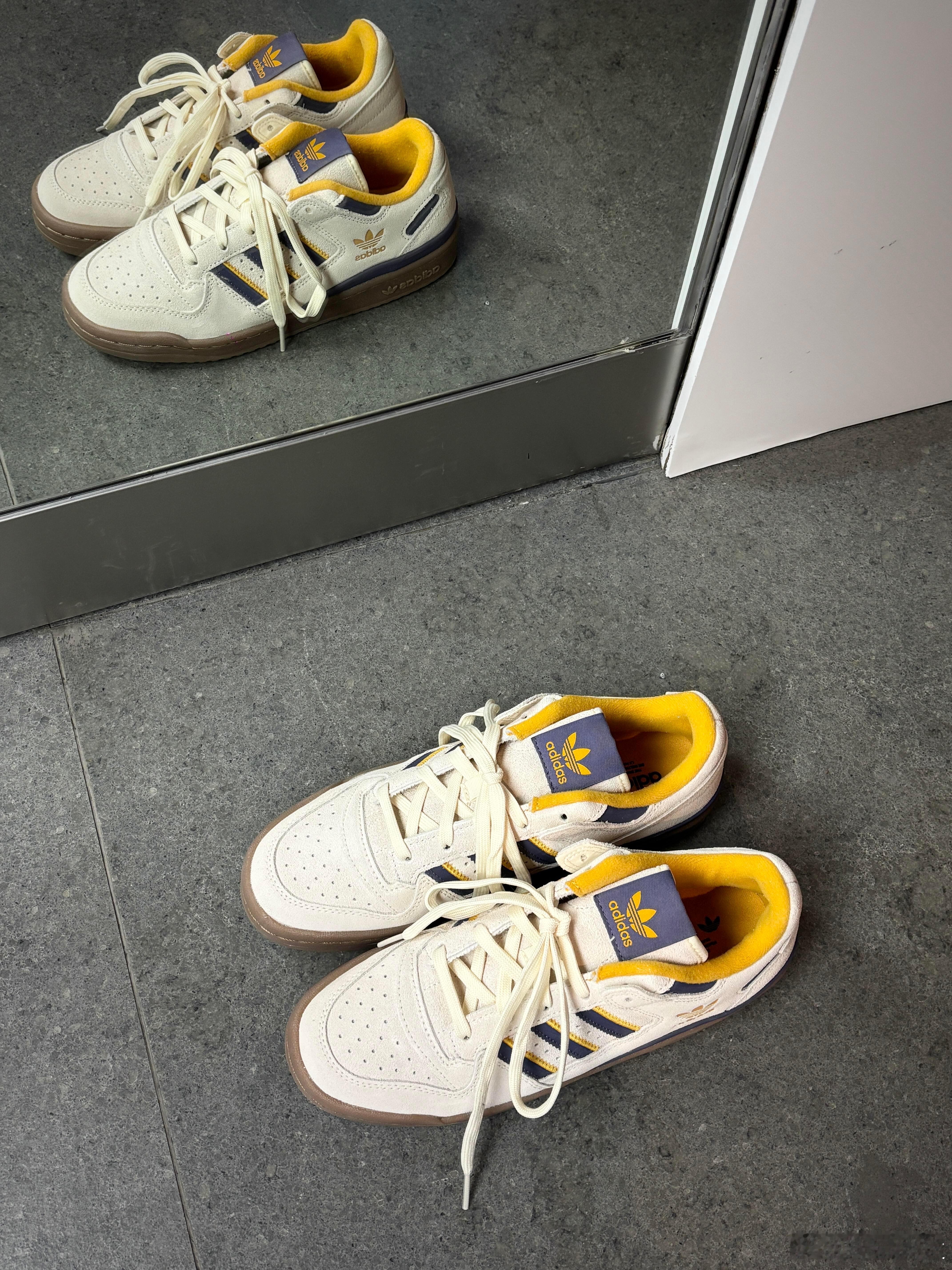 这是阿迪达斯Originals系列的FORUM运动鞋,以其复古篮球鞋的经典轮廓而备受喜爱。鞋身以纯净的白色为主调,搭配亮眼的黄色鞋口内衬与标志性的蓝色三条纹,形成鲜明而活力的视觉碰撞。鞋舌上饰有金色的adidas Originals徽标,彰显其品牌身份。浅棕色的做旧风格鞋底,则为整体增添了一抹复古韵味。