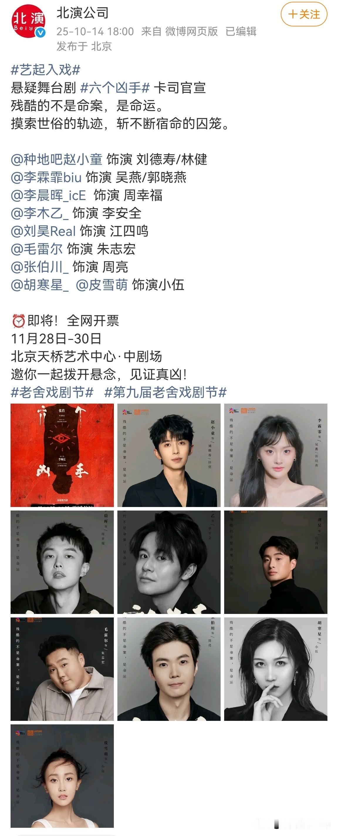 10月14日,赵小童发文说:“什么样的人生我都能接受,只因为遇见了你。” 小童终于给我们带来了他的好消息,那就是他将主演舞台剧《六个凶手》,小童是该舞台剧的男主角,其他演员我都不认识。 这部舞台剧将于11月28日至30日在北京首演,北京的朋友可以期待一下。 难怪前几天小童一直闪现北京,原来他是在闷声干大事。小童还写了一首歌,期待他的新作品。 除了赵小童以外,蒋敦豪刚在成都完成了两场音乐剧演出。敦敦还官宣了一档新综艺《一起开麦吧》,他将在节目中担任组合培训师。 陈少熙也一直剧组拍戏,《红舞鞋》是陈少熙的第一部电视剧。 陈少熙在综艺《种地吧》中当“新农人”,拍电视剧也在种地,这就是大家说的“戏剧源于生活”。
