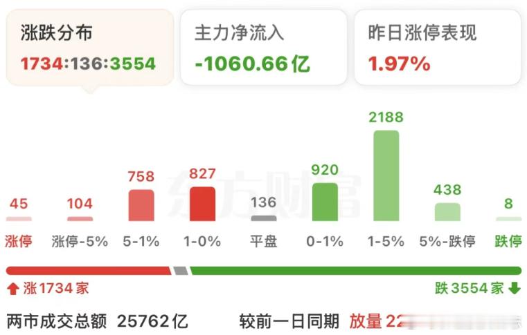 早盘指数还一片红,个股4000多家上涨;收盘创业板、科创板双双大跌4%,个股3500家绿盘。中位数-0.92%,成交2.6万亿,放量了2200亿。