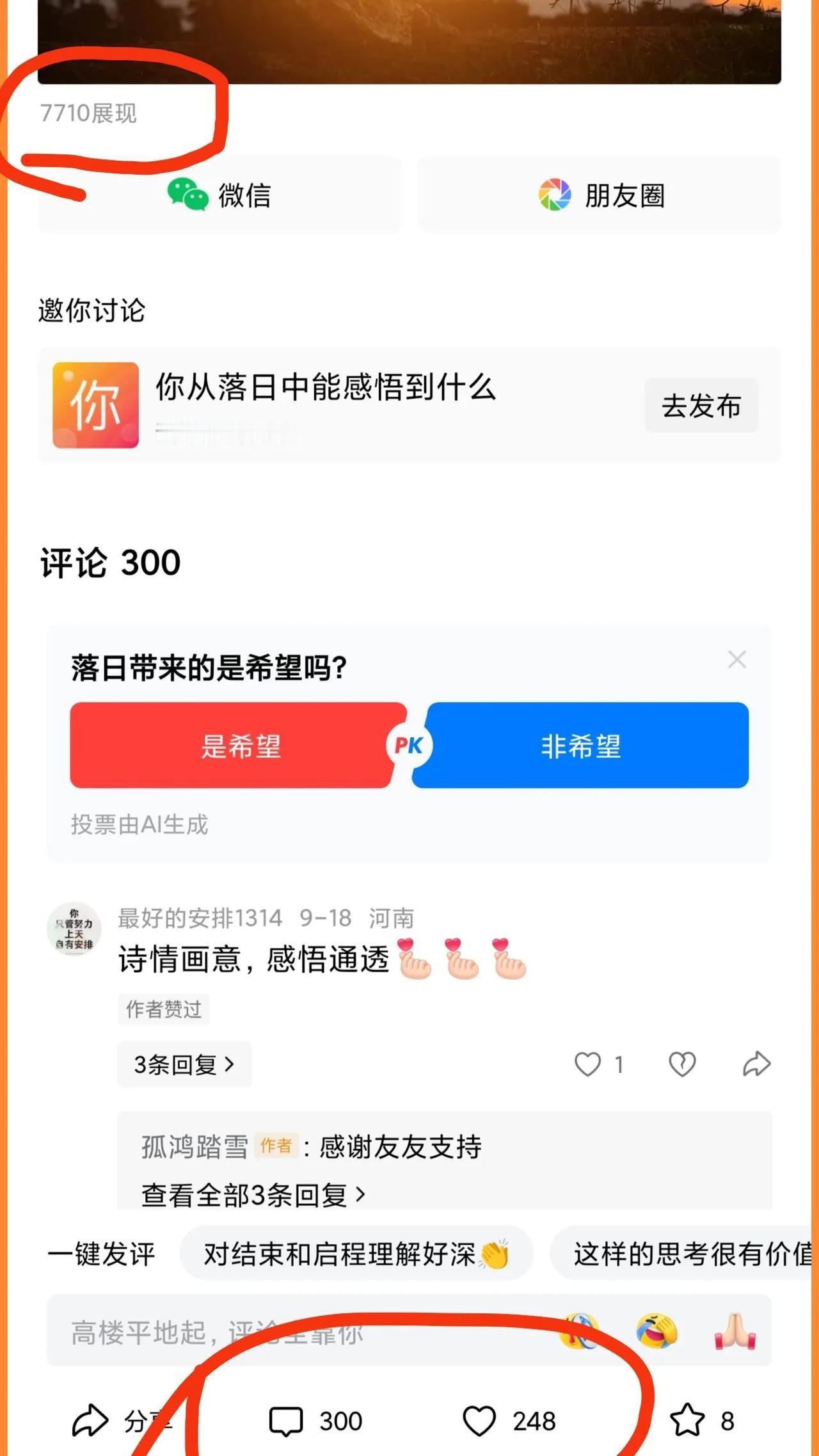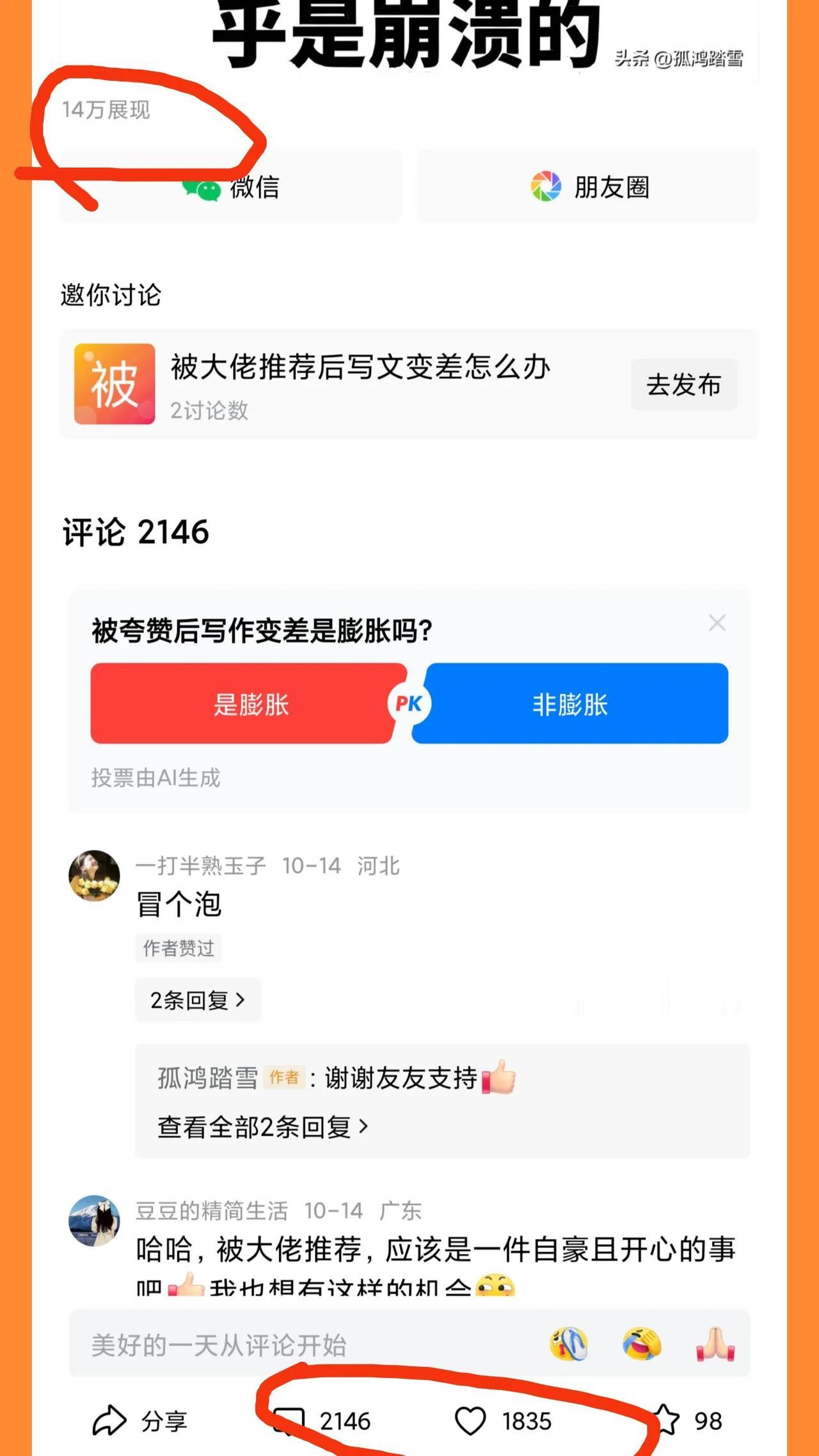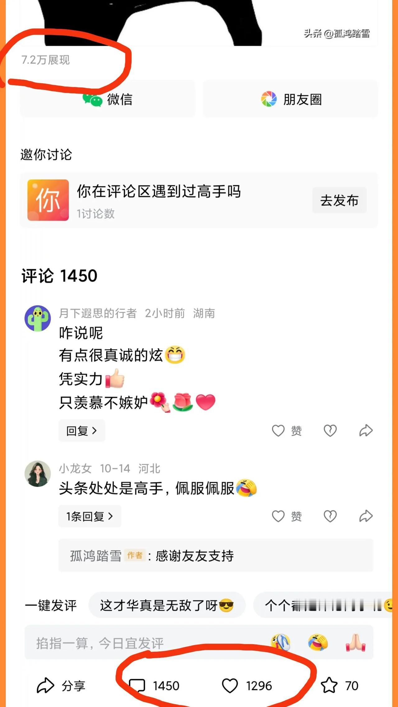 原来有些账号是靠炒作起来的,没有团队的友友就死了心吧,想在平台做起来,只能靠真才实学默默耕耘了。 比如这个叫“孤红踏雪”的账号,他刚开始发的微头条,展现量为7700个,按比例估算,阅读量一般在770-1400之间,就这样一点点阅读量,正常的话,评论量和点赞量都是个位数,但他这个有300多条评论,200多个点赞。 一个月之后,他发的作品展现量到了7.2万,阅读量大概在7200-14000之间,但评论量已经达到1400多条,点赞量也达到1200多个。 不到两月之后,这个账号的粉丝才涨到几千个,但他最近发的一篇微头条,展现量为14万,阅读量大概在14000-28000之间。 结果这么一点阅读量,评论量已经突破2100条,点赞量也接近1900个。正常来说,一篇文章如果达到这样的互动指数,阅读量差不多有20万+了,妥妥的大V级别了,但他的粉丝才几千个。 为什么说是炒作起来的呢,因为这个账号发的作品,每一篇的数据都和普通账号发的作品不一样,一个是阅读量不高,但评论量和点赞却高的离谱。 二是他的作品无一例外——评论量都高于点赞量,这样的数据也不符合一般作品“点赞量高于评论量的”的客观规律。 有点友友可能就要说了,人家评论量和点赞量高是因为作品水平高,这个确实没毛病,那既然水平这么高,为什么粉丝量没跟着涨上去呢? 大概率是有其他账号在反复推,然后很多想学习,想涨粉的自媒体就点进去看了他的作品,并各种积极评论,大家都以为互动就能带来流量嘛!