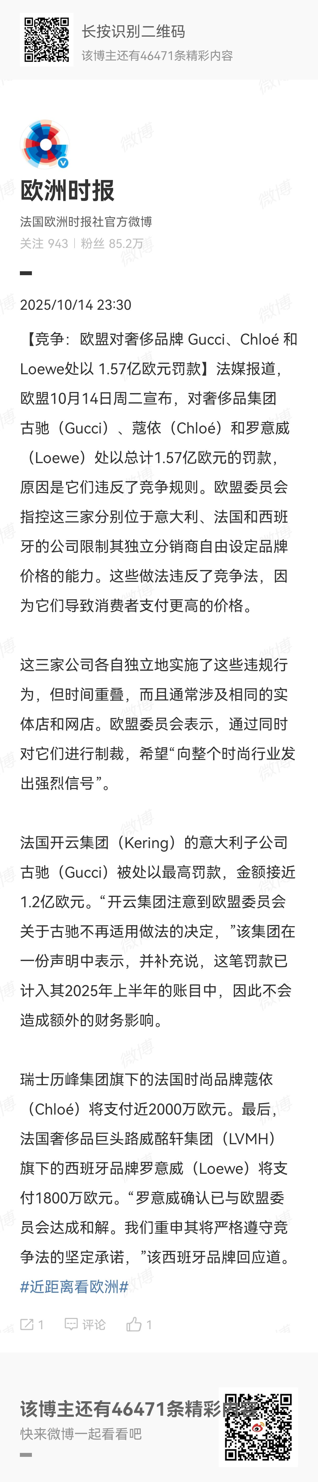 据欧洲时报报道:欧盟对奢侈品牌Gucci、Chloé和Loewe处以1.