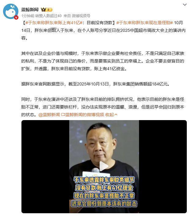 10月14日,胖东来创始人于东来分享在2025中国超市调改大会演讲内容,透露胖东来账上有41亿且无贷款。这实力太惊人! 于东来认为企业要有社会责任,价值在于员工幸福,反对盲目扩张。胖东来官网显示,截至10月13日销售额超184亿,本月超11亿。国庆、中秋“双节”期间,每日销售额约1.02亿。不过于东来也提到,现在胖东来太拥挤,像怪胎,没了原本的温馨浪漫,但他相信迟早会回归正常。不得不说,胖东来不仅赚钱厉害,理念还这么正,值得点赞!