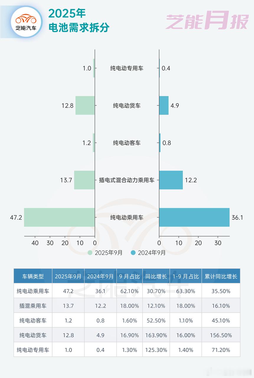 动力电池装车量增长显著,磷酸铁锂占绝对主导,三元表现欠佳,纯电乘用车和货车为主要拉动力量。
