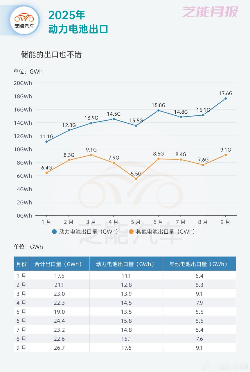 9 月电池产销量环比同比均双增,1-9 月累计量均突破大关,储能需求持续放大。合计出口增长,动力电池占比高但储能出口增速更快。