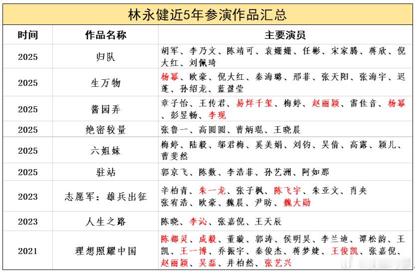 网友总结了林永健近5年作品合作的流量演员,好多人啊。林永健人日发文批某顶流演员排场大