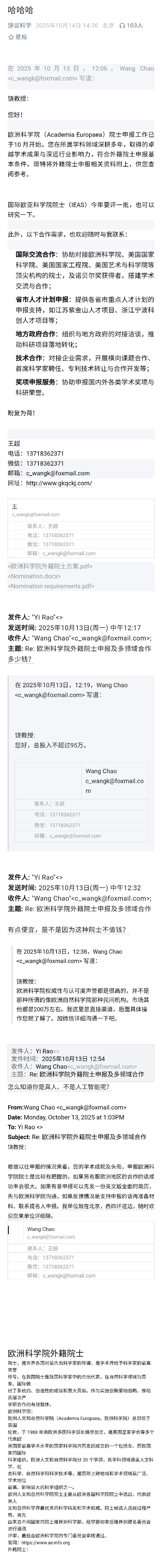 哈哈哈 饶教授这是断了别人的财路,还是帮对方做广告呢? 说不定,没有收到邮件的教授,看到其中的联系人电话、邮箱,会主动联系,搞一个院士头衔。反正花的钱也不是自己的,就是花自己的钱,弄到一个院士头衔,也可以挣回来。