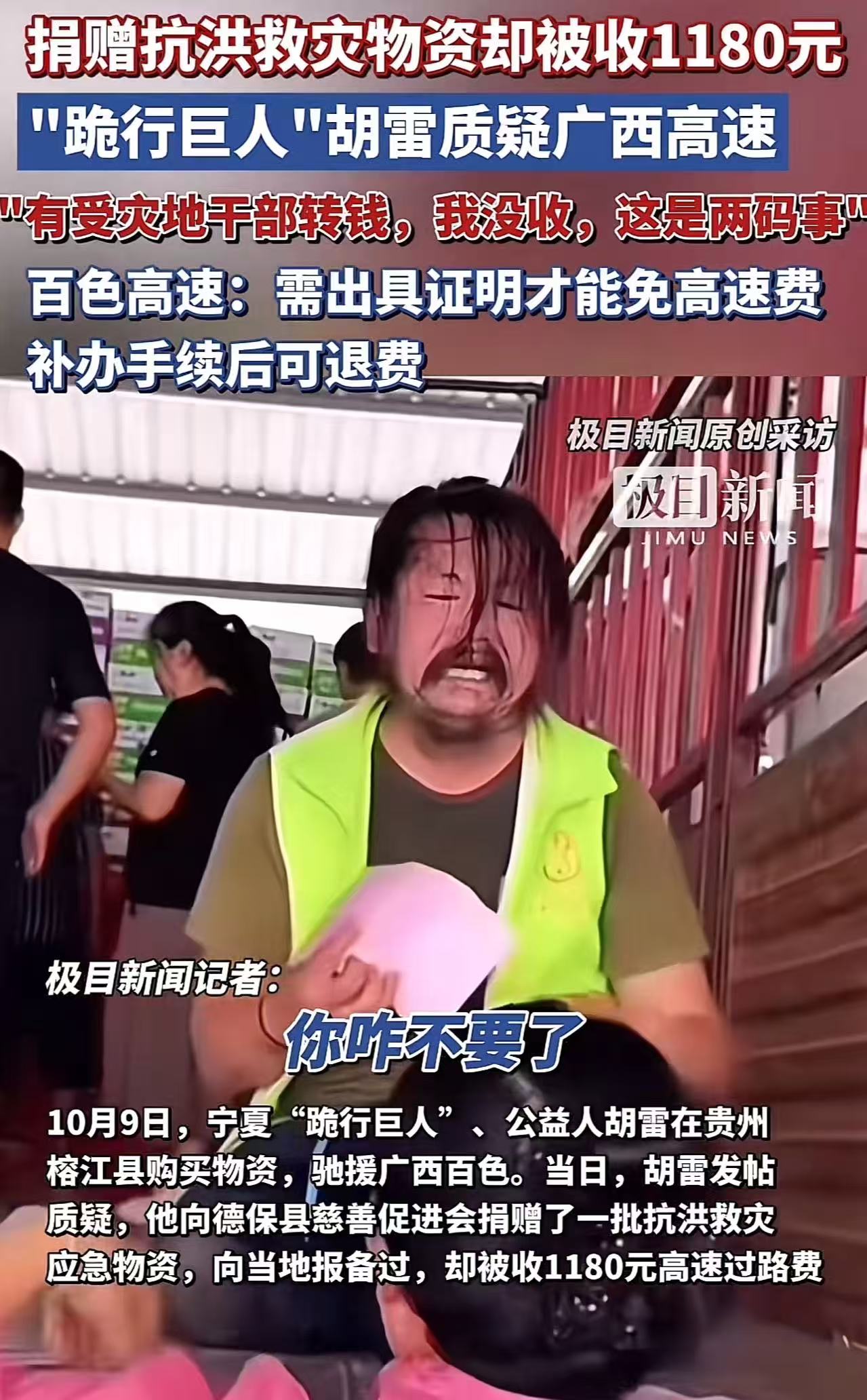 “广西高速火了!”胡雷向广西百色捐赠抗洪救灾物资,走高速报备后仍被收取1180元高速费!胡雷:全中国只要报备的物质,都是免高速路费,这是我们国家规定的事,为什么到了你们这地方就没有呢?反而刁难我们!