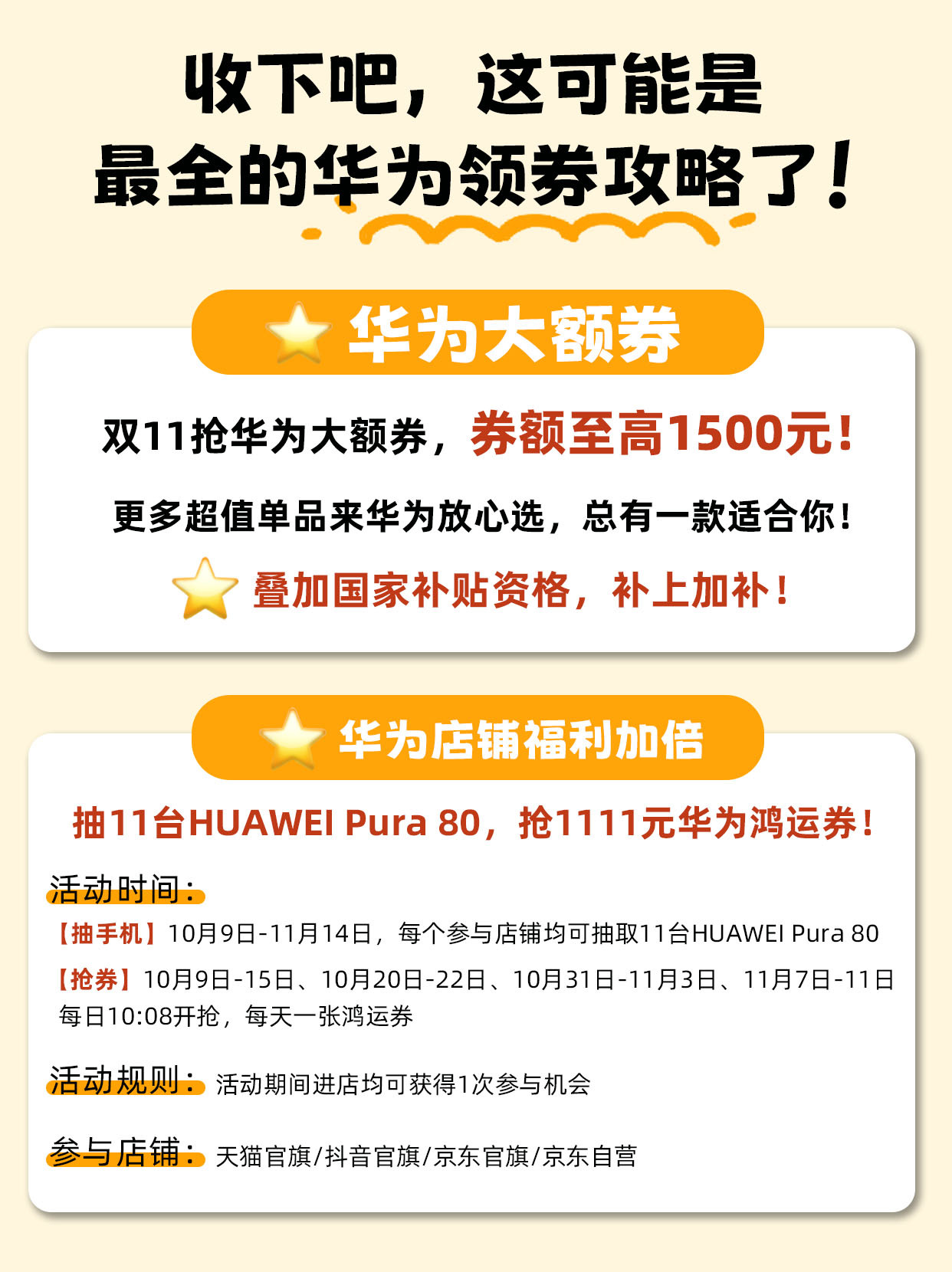 今年最佳“理财”项目出现了!天猫双11来啦!上淘宝或天猫APP搜索【华为大额券】,抢券额至高1500元的大额优惠券,领了直接就能用!华为Mate 70 Pro优惠后5299起,Pura 80优惠后4399起,还可再叠国补!省到就是赚到,还可进店参与抢好券、抽大奖的惊喜活动!天猫超级国补日 双11上天猫抢华为大额券再叠补贴 刘涛喊你上天猫领华为大额叠国补