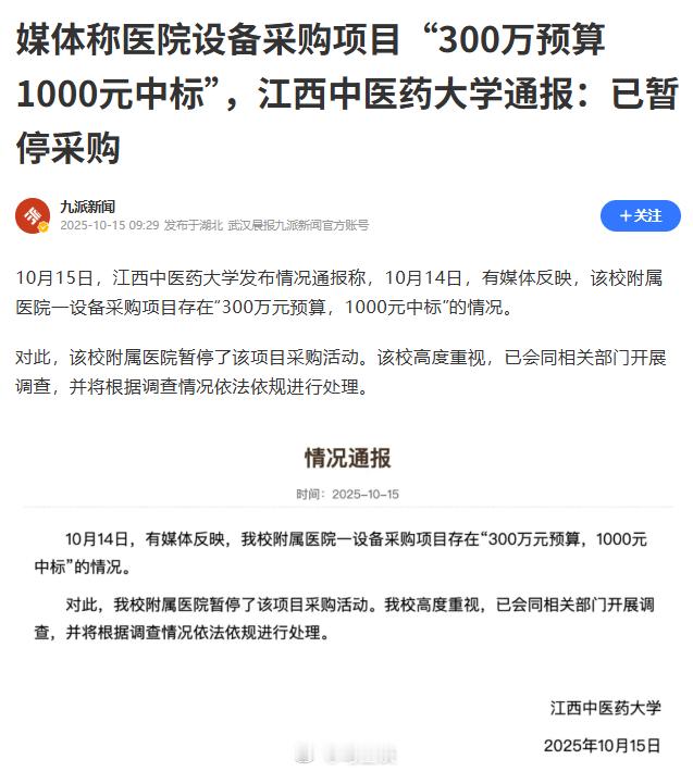 医院300万预算1000元中标,是真心低价,还是什么套路?媒体报道,江西中医药大