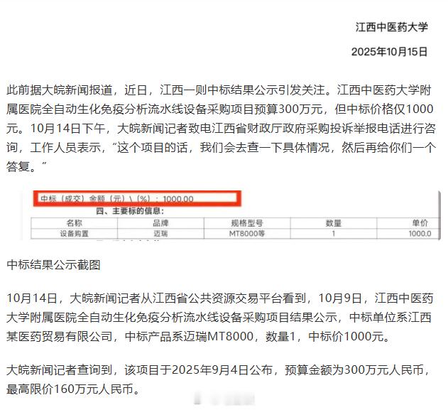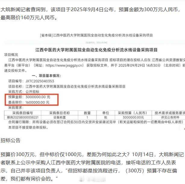 医院300万预算1000元中标,是真心低价,还是什么套路?媒体报道,江西中医药大学附属医院采购“全自动生化免疫分析流水线设备”,预算300万元,最高限价160万元,但中标价仅1000元,不足预算0.03%。