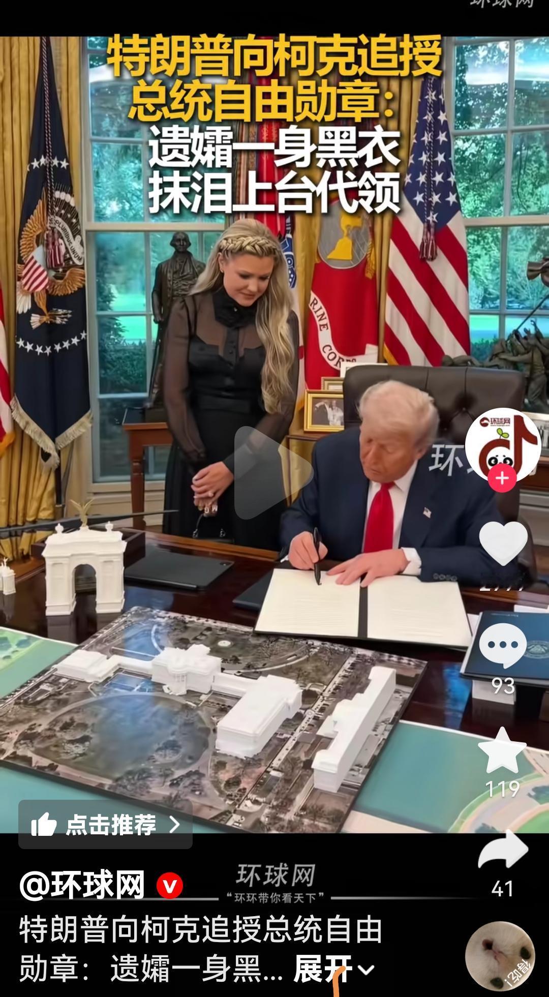 特朗普向被刺杀的政治盟友柯克追授总统自由勋章,由他的妻子代领 根据美联社报道10月14日美国总统特朗普向此前被刺杀的美国保守派人士查理柯克授予总统自由勋章 这天刚好是查理柯克的32岁生日,这枚勋章将有他的妻子代领 这次他的妻子在领勋章时哭了也抹泪了,比上一次难过多了[捂脸]查理柯克遇刺 特朗普刺杀事件 特朗普诺奖 图片来自环球网视频