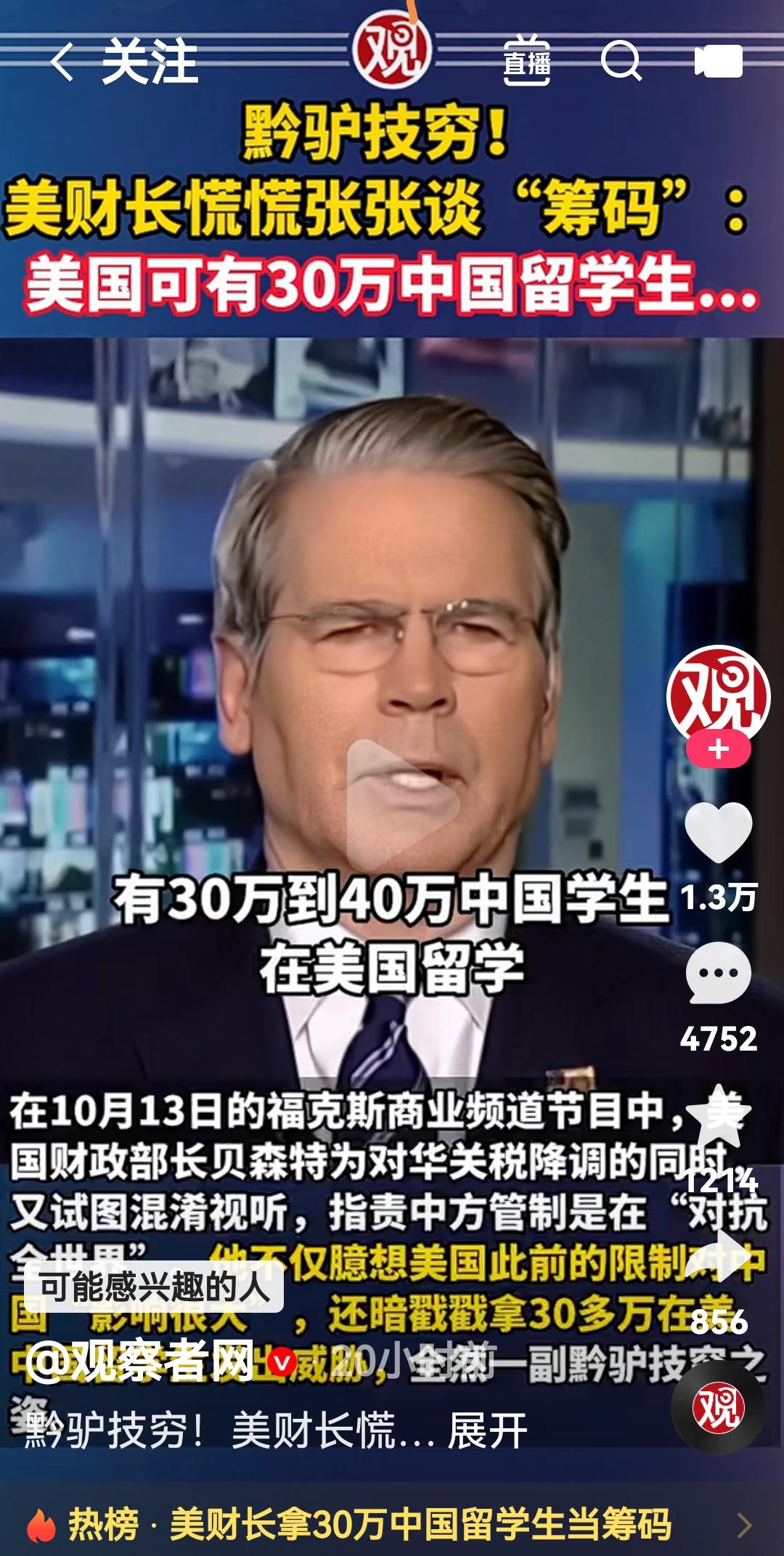 美国财政贝森特对于贸易战无计可施了又盯上中国在美国30到40万留学生了 根据美国媒体报道,10月13日贝森特在接受采访时为了表现美国对中国贸易战的强硬,说前一段时间特朗普对中国贸易战效果非常好,对中国影响很大,但是为了强硬他说在中国留学的美国留学生只有800人,而在美国留学的中国留学生有30到40万人,这是无计可施了,胡乱乱用政治手段打压对手,暴露出美国自身问题很大,很不自信美国对华贸易战 美国全球关税战 图片来自观察者网视频