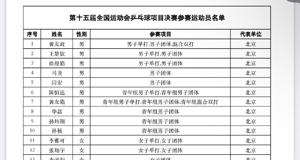 根据全运会报名名单公示本届全运会马龙只参加男团比赛