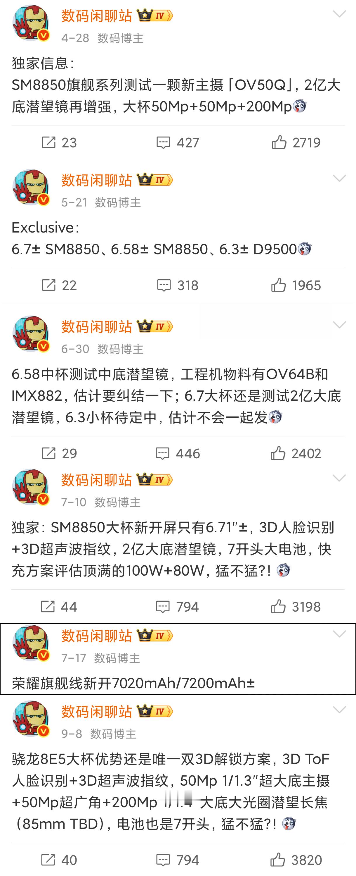 6.71"1.5K+120Hz LTPO等深四曲屏,4320Hz PWM,前置50Mp+3D人脸识别,后置50Mp F1.6 1/1.3"主摄+50Mp F2.0超广角+200Mp F2.6 85mm 1/1.4"潜望长焦,骁龙8 Elite Gen5,7200mAh+120W+80W,3D超声波指纹,IP68/IP69/IP69K,1216双扬声器,1TB有北斗卫星短信