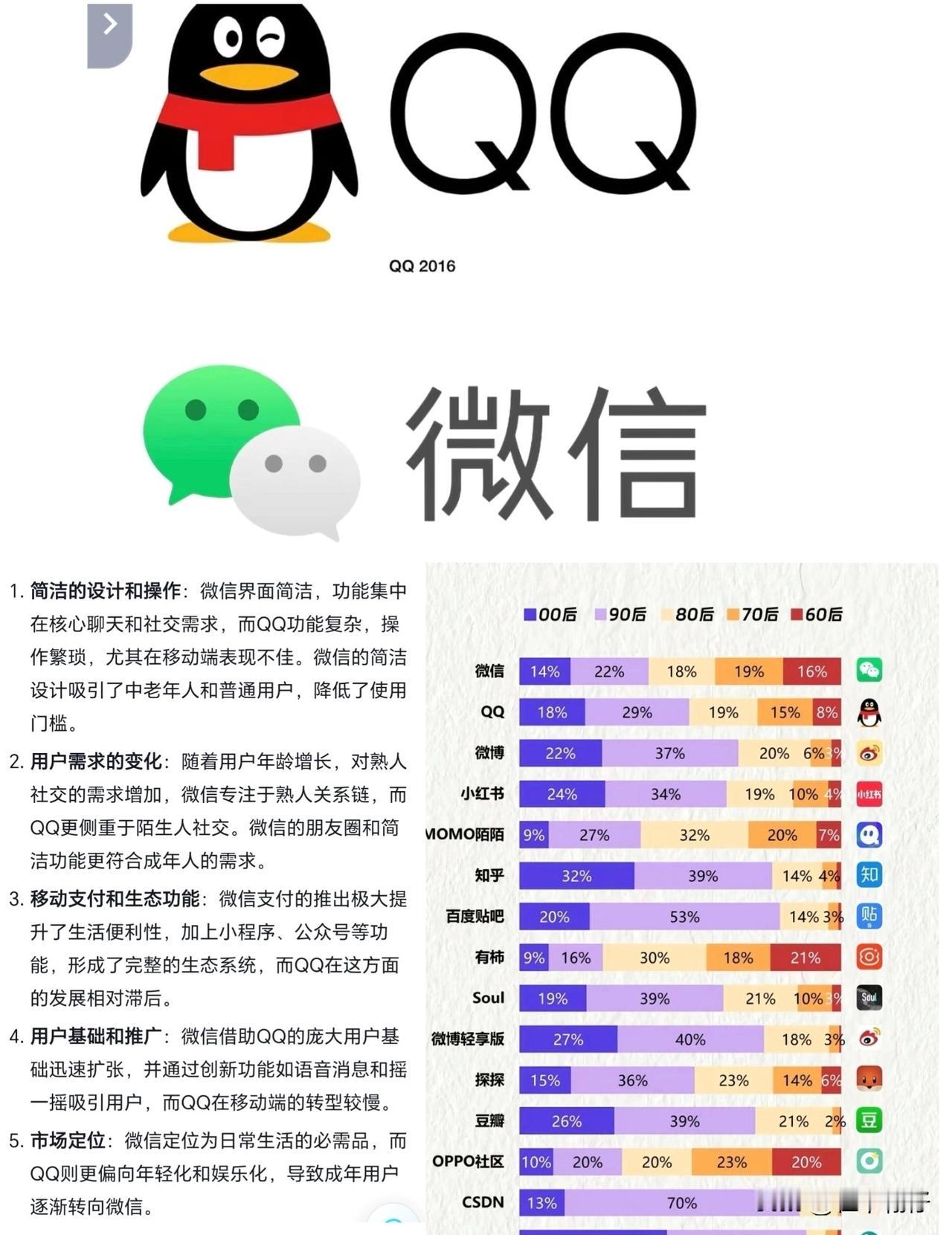 一点也想不起来当初为什么会开始用微信…… 就好像是小时候的某一天下午 看完动画片关上电视 就结束了童年的时候。 也不知道是哪一天, 退了 QQ 就很少登录, 然后就一直在微信了。 好在那个时间都留在了 QQ 空间里, 只是偶尔偶尔更新。 可能是觉得微信很方便简洁! 而且最重要的是有微信支付, 熟人社交! 现在习惯了用微信, QQ都几乎不用了。 对于大部分中老年人来说 真的是完全取代了。 不是 QQ不好用, 是微信踩准了移动时代的节奏。 从聊天工具变成刚需基础设施。 现在是每时每刻都会打开看 。 我们并不是在某一天郑重地告别了QQ, 只是在人生的旅途中, 自然而然地换上了一件更合身的外套。 而QQ, 依然是那个收藏着我们无数“火星文”和“踩踩”的, 永远温暖的旧房间。
