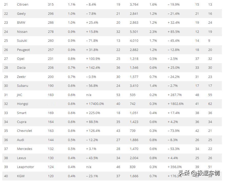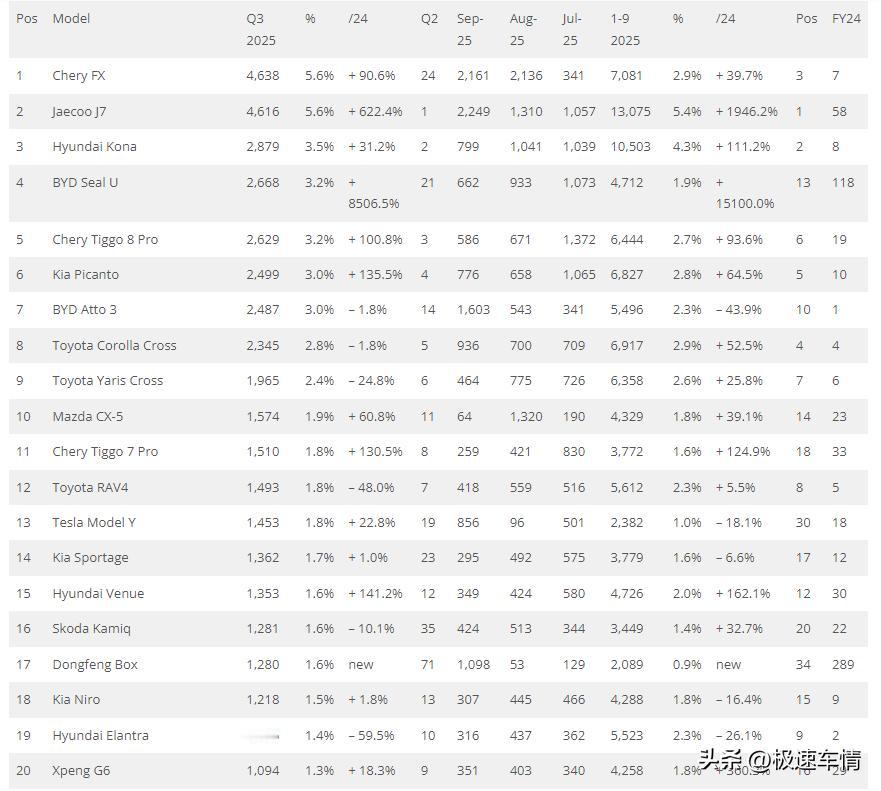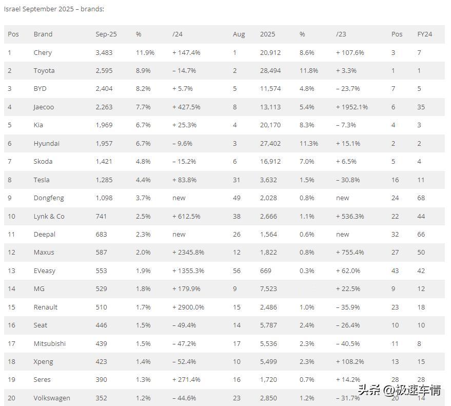 9月,以色列车市继续同比激增。中国品牌占据绝对主导地位,奇瑞连续三个月夺冠,奇瑞的每一次进步都在创造中国品牌的历史。奇瑞Jaecoo、比亚迪、东风等品牌多点开花,新品牌持续入场;季度车型榜中,中国品牌包揽前二,比亚迪Seal U等新能源车型以超高增幅印证市场认可度。中国品牌有望突破50%份额,进一步巩固在以色列市场的主导地位。 2025年9月,以色列新车销量同比激增28.8%至29,299辆,市场增长势头强劲。 2025年1-9月,累计销量同比增长6.9%至242,037辆。 中国品牌表现极其出色:品牌榜前十占五,把以色列变成了俄罗斯,中国车企占据49.5%市场份额!创下历史新高! 奇瑞:3483辆,第一名,市占率11.9%。 比亚迪:2404辆,第三名,市占率8.2%。 奇瑞Jaecoo:2263辆,第四名,市占率7.7%。 东风:1098辆,第九名,市占率3.7%。 领克:741辆,第十名,市占率2.5%。 深蓝:683辆,市占率2.3%。 Maxus:587辆,市占率2.0%。 江铃:553辆,市占率1.9%。 名爵:529辆,市占率1.8%。 小鹏:423辆,市占率1.4%。 赛力斯:390辆,市占率1.3%。 吉利:296辆,市占率1%。 极氪:200辆,市占率0.7%。 江淮:183辆,市占率0.6%。 红旗:175辆,市占率0.6%。 零跑:124辆,市占率0.4%。 岚图:110辆,市占率0.4%。
