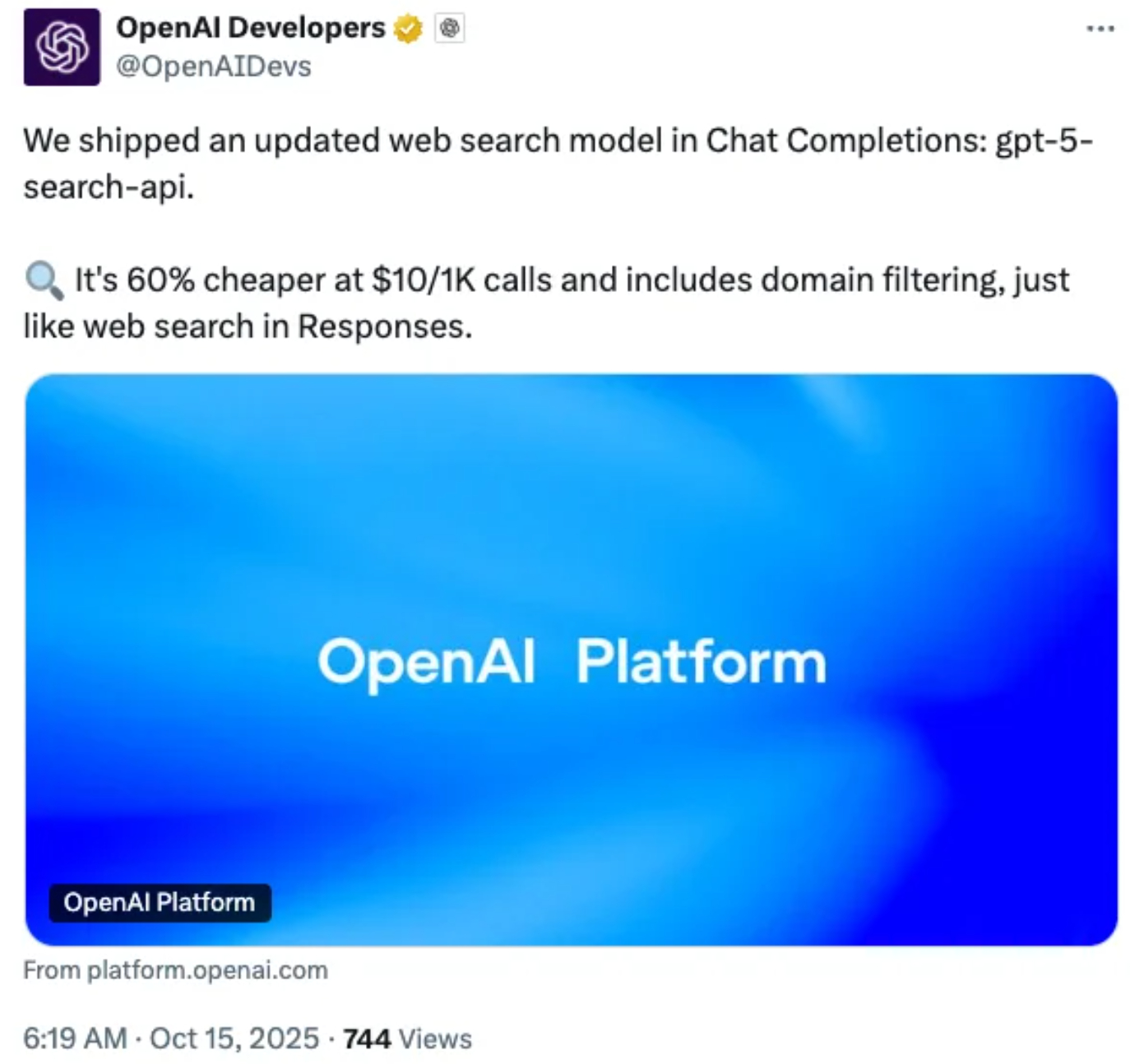 OpenAI推出新版搜索模型gpt-5-search-api,在Chat Completions中上线。价格直接砍60%,每千次调用10美元,还能自定义域名过滤。