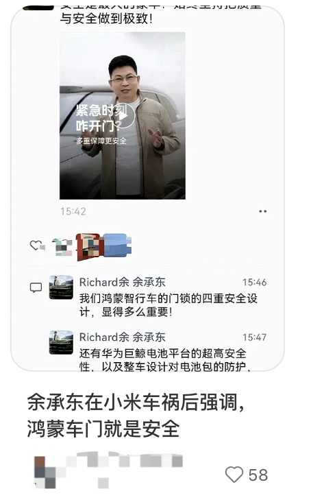 【小米汽车事故后,余承东发文:我们车门锁有四重安全】近日,余承东发文强调,“安全是最大的豪华!”他还引用了今年7月发布的一个紧急时刻如何开车门的视频。该视频演示了紧急时刻下,如何在鸿蒙智行车内打开车门。