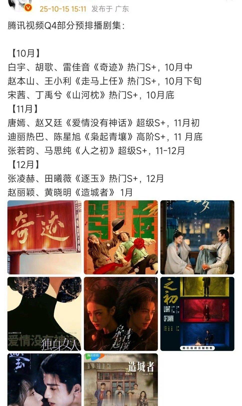就是说腾讯视频这下要干大事的节奏啊!没想到Q4居然有这么多电视剧要播,从10月份就有《奇迹》《山河枕》,还有11月份的《枭起青壤》和《爱情没有神话》。没想到年底还有赵丽颖《造城者》已经等不及追剧了!