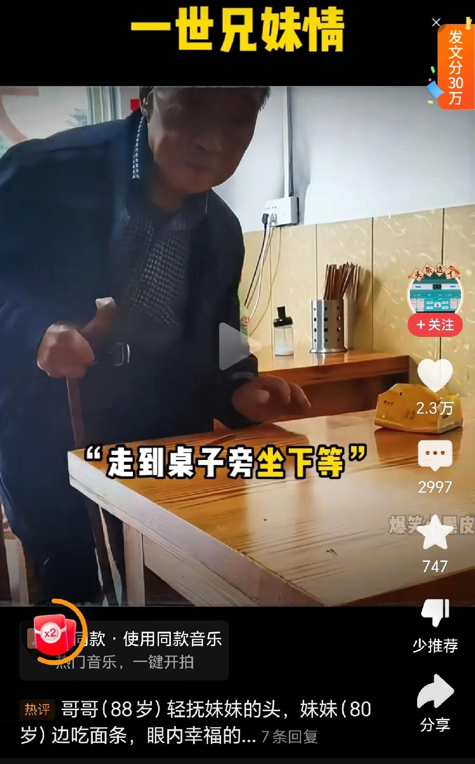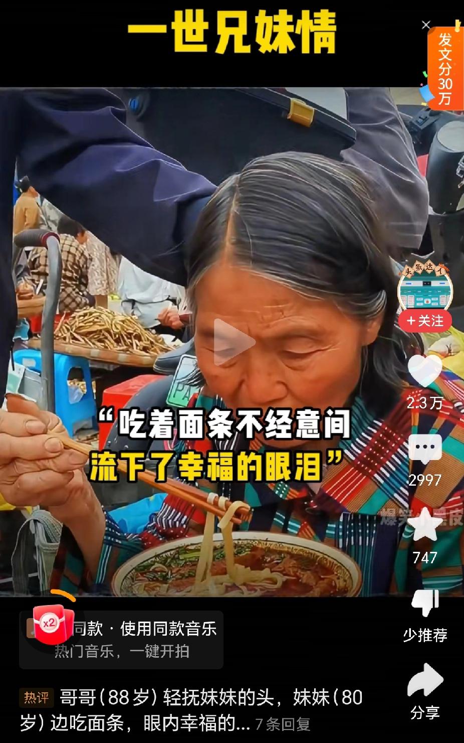 “深情了,88岁的哥哥逛集市遇到了80岁的妹妹在摆摊!”近日,一位博主的一条视频阐述了什么叫兄妹情深?哥哥颤巍巍地为妹妹端来面条,还摸了摸妹妹的头,看得眼泪都掉下来! 据博主视频报道,在一个集市的早上,88岁的哥哥举着拐杖逛街,看到了80岁的妹妹正在街头摆摊卖农产品。 哥哥于是走上前去,简单的聊了几句,并没有多说什么话,转身就走了,走进了街边的粉面店。 在面店哥哥点了一碗牛肉面条,当服务员把面条端过来的时候,哥哥却起身将面条端到妹妹的面前,让妹妹吃。 妹妹吃着面条,眼角不经意流出了幸福的眼泪。“小心烫,慢点吃!”哥哥轻声的对妹妹说,还慈爱的摸了摸妹妹的头发。 “一世兄妹情,在这一刻具象化了!”有网友说,到了这个年龄,虽然同住一个集镇,可能见面的机会都不多,真的是见一次少一次呀。 “有个哥哥的关心真好!”有网友说,亲兄妹的情谊是无法用言语来表达的,一个温暖的举动,一碗面条,让一世的兄妹情谊永续! “心肌梗死在医院住院,一江之隔(100公里)的姐姐都没人看一眼!”有网友说,当时姐姐就在我所在的城市旅游,当时在医院就把姐弟之情断了。 年纪越大,情感越深。手足同胞之情,随着岁月的流淌,在不断的加深。在有生之年,能够相互关爱,给予温暖,这就是人世间最浓的情! 对此,你的看法是怎样的呢? 今天,你的心情怎么样 兄妹情 @秋实99 关注人生冷暖,拥抱幸福生活!