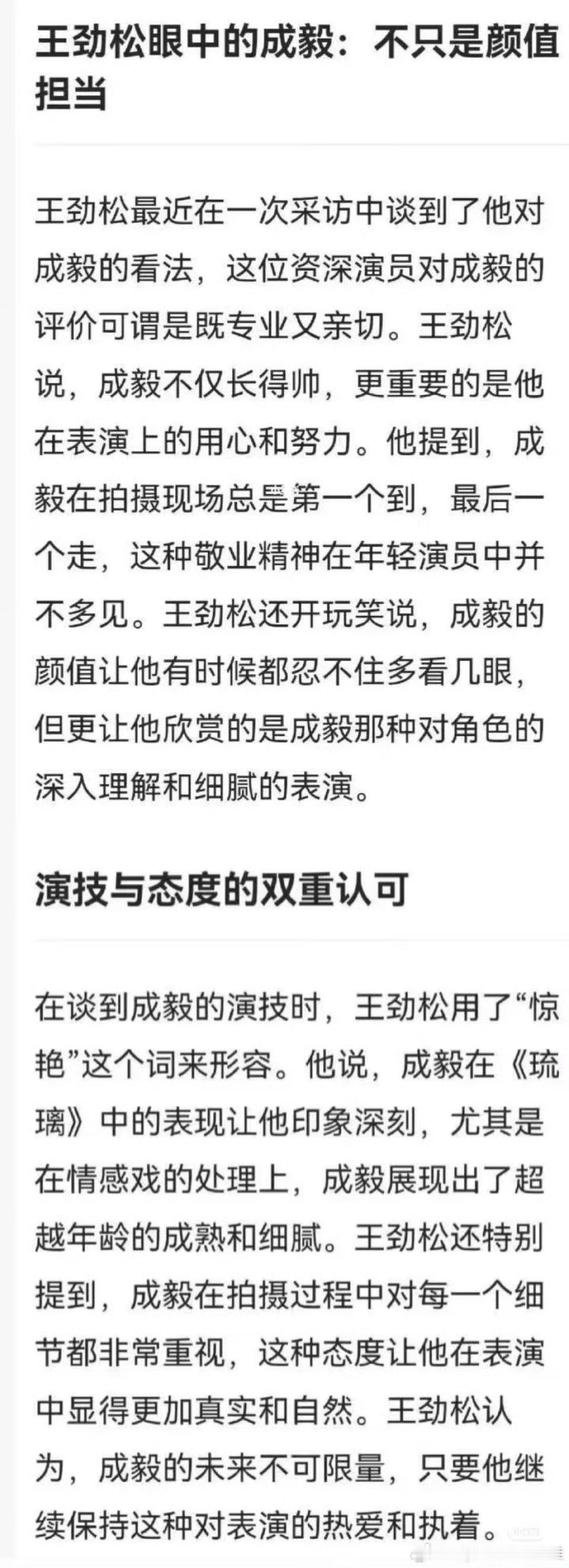 早就说过很多次了,成毅是好演员 甚至是戏痴,理想照耀中国导演夸能遇上他这么好的演员三生有幸,十几年第一次见这样的一线艺人主动不要片酬,不住五星级酒店,不要特餐、不用房车,零下二十几度的夜外,跟剧组一起同吃住!演员王劲松说成毅的敬业精神在年轻演员里并不多见,演技成熟细腻、真实自然,对每一个细节都十分重视!