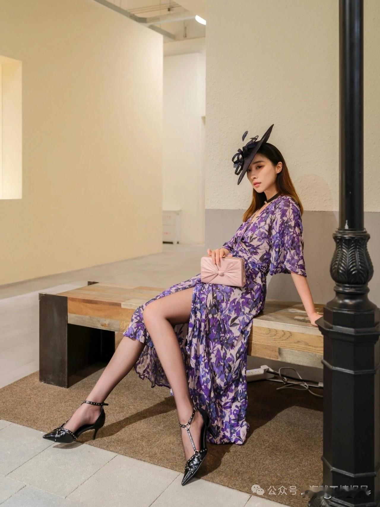 紫色长裙搭配粉色小包,处处透露着优雅与自信!