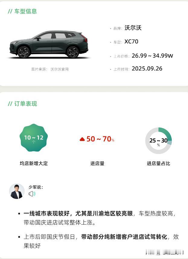 豪华新能源沃尔沃XC70备受关注 10月15日,据沃尔沃全新XC70上市销售数据,豪华新能源的代表XC70的市场热度远超预期。 数据显示,新车均店新增大定订单8-12台。全新XC70的上市有效拉动了品牌整体进店量,其进店量占比达25%-30%,并带动整体进店量上涨50%-70%。 从用户画像看,新车吸引了35-55岁、高学历、高收入的男性客群。配置选择上,四驱超长续航Plus版成为绝对主销,四驱车型占比更是高达95%,此外,霞光灰外观与豆蔻褐内饰备受青睐。区域市场中,一线城市表现强劲。