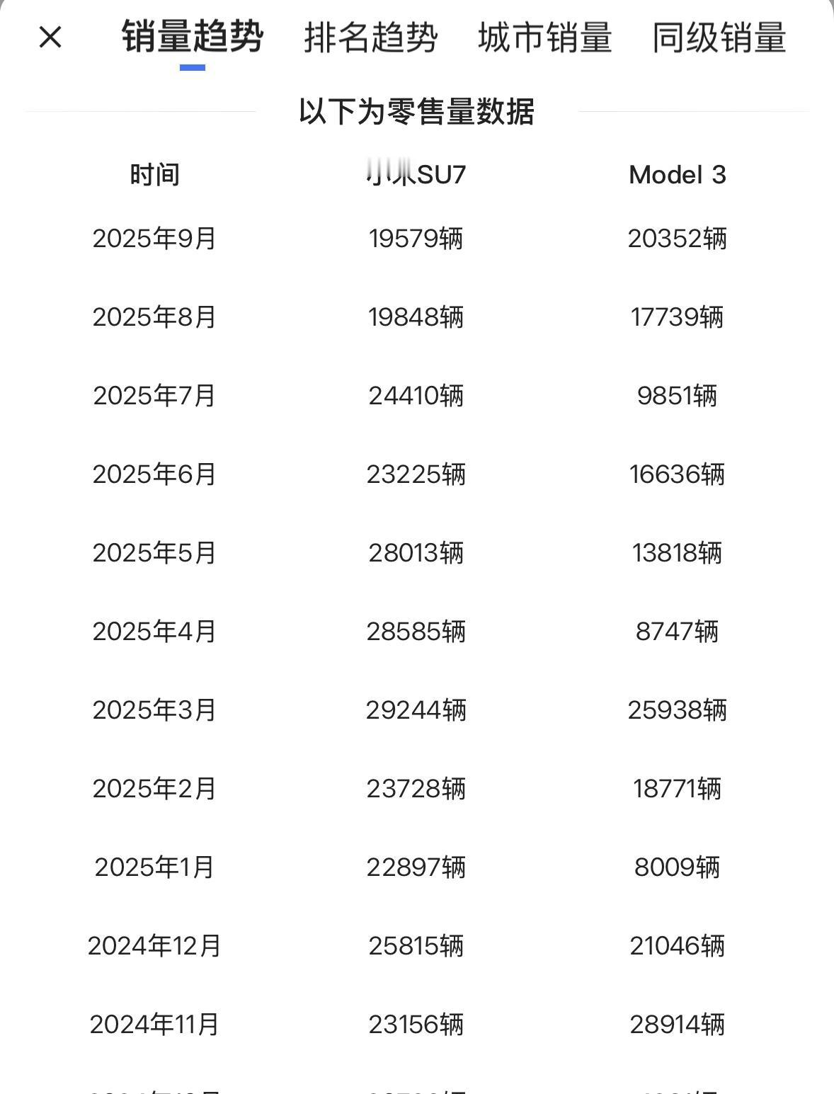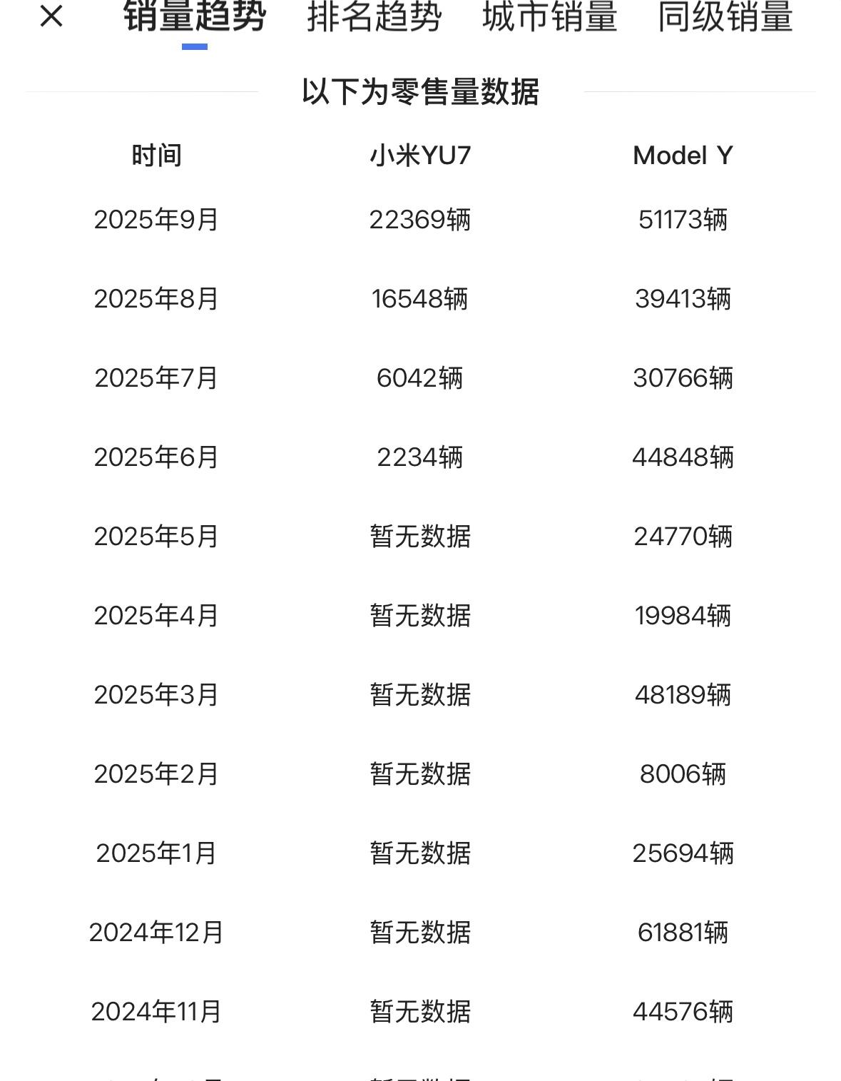 2025年1-9月小米汽车对比特斯拉销量 小米SU7:219529辆 Model 3:139861辆 小米YU7:47193辆(6-9月) Model Y:166200辆(6-9月) Model Y:292843辆(1-9月)