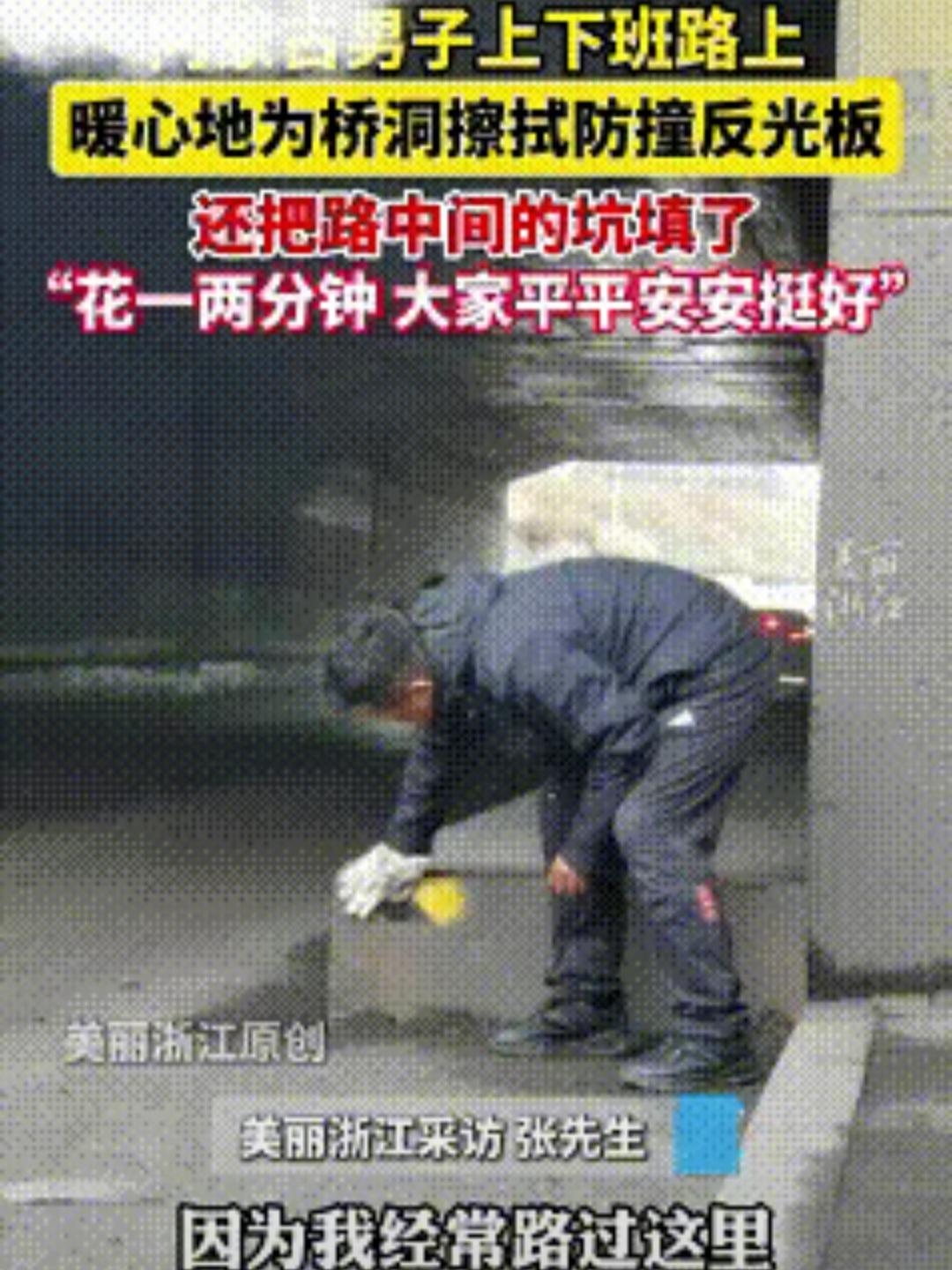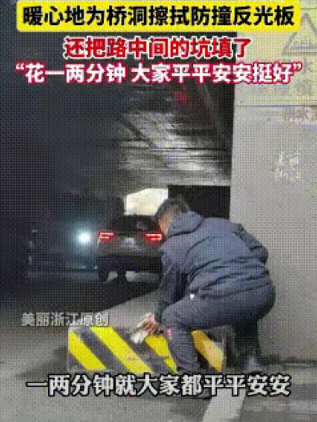 “心好善”!10月14日,内蒙古包头,张先生上下班时要穿过这个桥洞,当看到桥洞两头防撞反光板脏了不亮了,他便会停下来,随后找点什么将其擦拭干净。由于反光板经常脏,张先生便带了一块抹布,擦完直接塞进墙缝,以便后续继续用。 很快,张先生的好人好事被过往司机记录并分享,面对镜头张先生直言:“我经常路过这里,这里过往的大车很多,晚上这里又没有灯,黑漆漆的一点都不安全,为了大家的安全,我就把反光板擦拭干净,好让司机们看清路线,让他们安心过路,花一两分钟,大家平平安安挺好!” 此外,桥洞中车来车往,没多久中间多了一个坑,张先生和过往司机商量后,决定一人带一桶砂浆,几人合力把这里填平了。看得出来,正是张先生大爱无疆、与人为乐,这才感染了好多司机,大家伙齐心协力保证桥洞的安全。也正应了那句话:“爱是会被传染的”! 生活中,咱们就要做张先生这样的人,把爱心奉献出去,将平安带给大家,不论何时都要做个助人为乐、无私奉献的人。但凡人人如此,届时车车平安无事,人人安居乐业,将使得这个社会更加和谐、美丽,这是多么美好的事。各位网友。这事你咋看?