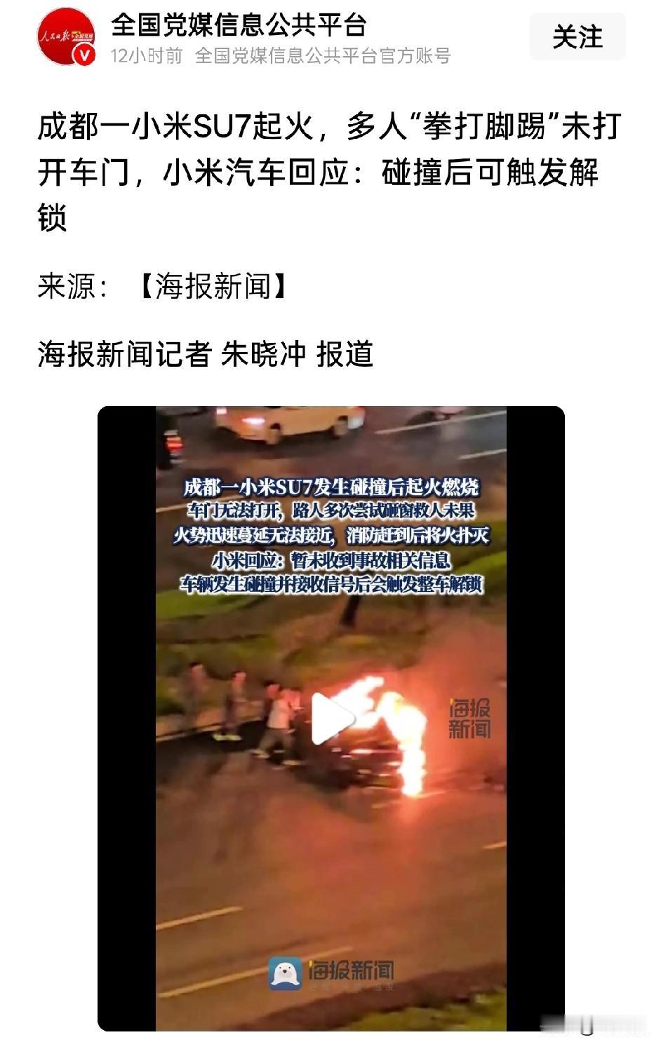 成都小米车祸现场,多人救援,无奈打不开车门,针对这个情况,小米公司做出回应,碰撞后可触发解锁! 可触发解锁,而不是解锁一个,否则就打开了,只可惜这辆事故车没有触发成功,否则就打开了,毕竟那么多救援人员拳打脚踢!怎么就不能触发呢!先是交通事故已经碰撞了,救援人员又是拿工具碰撞了,硬是没有触发成功解锁🔓 发生交通事故是酒驾,但是打不开确实让人害怕!