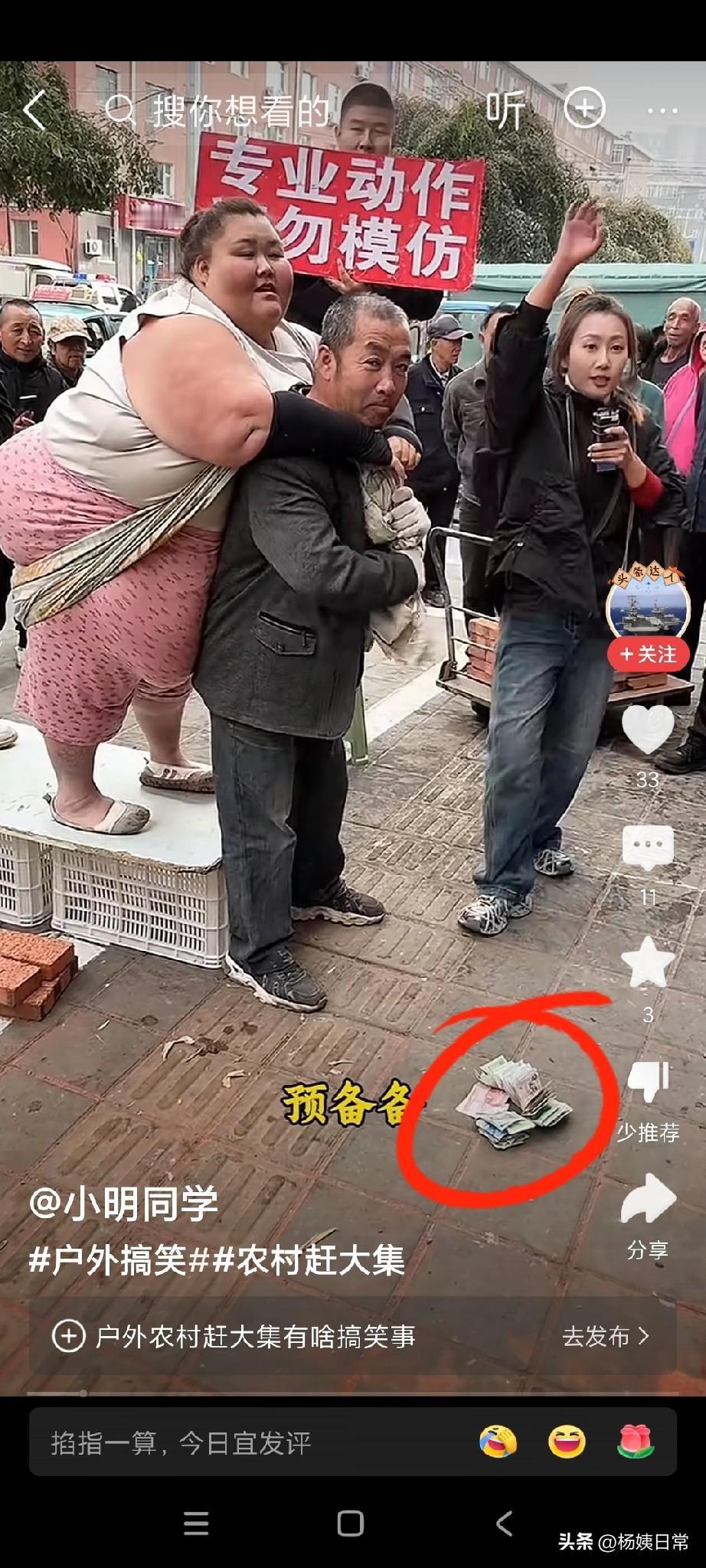 黑衣女子去农村赶大集开直播,说谁能背的动这个胖女人,这堆钱谁拿走,这个胖女人,看样子估计有五六百斤重吧?那个黑衣男子想拿这堆钱,他想去尝试一下背不背的动这个胖女人,那个黑衣男个子这么矮小。你们说他能背的动这个胖女人吗?