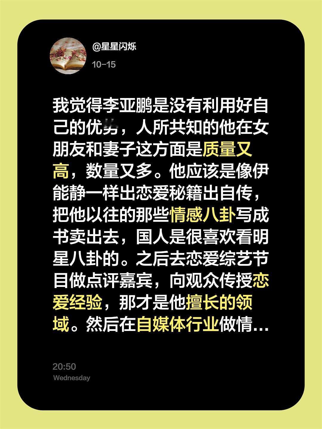 我评论了@杭州网 的作品: 我觉得李亚鹏是没有利用好自己的优势,人所共知的他在女朋友和妻子这方面是质量又高,数量又多。他应该是像伊能静一样出恋爱秘籍出自传,把他以往的那些情感八卦写成书卖出去,国人是很喜欢看明星八卦的。之后去恋爱综艺节目做点评嘉宾,向观众传授恋爱经验,那才是他擅长的领域。然后在自媒体行业做情感博主,恋爱导师。毕竟他在这方面属于传奇级的,实际战绩太亮眼了,能跟他相比的,也就只有“八离世家”的汪峰了。这几个行业同时操作,那钱不得像流水一样涌过来,可以快速的帮他还清债务,不比他在其它行业瞎折腾来的靠谱。李亚鹏 李亚鹏离婚 李亚鹏表白彝族姑娘海哈金喜