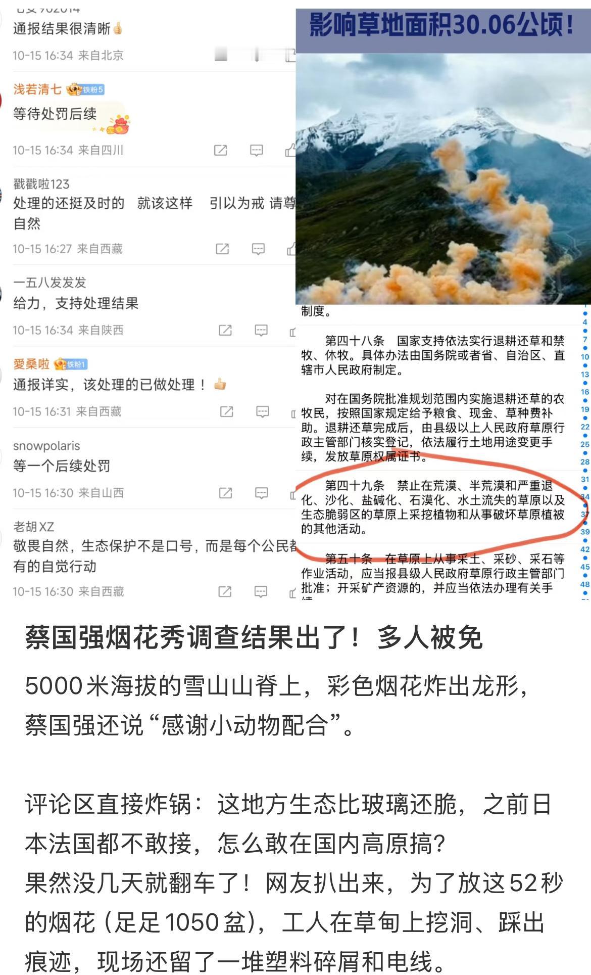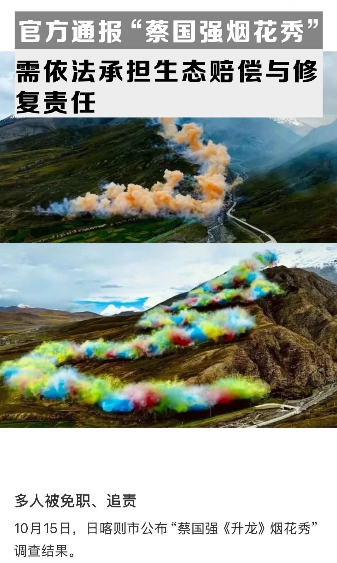 真没想到! 一场烟花居然让县官丢了乌纱, 之前我和网友还担心“烟花炸山”没人担责,现在看来真是多余了。 央视都报道了,蔡国强“烟花炸山”的属地江孜县,好几位县领导都被免职或立案审查,他工作室和“始祖鸟”公司也在被查。 这事儿明明白白告诉我们,不管是多大的艺术项目,不管涉及谁,只要踩了线,就别想蒙混过关,责任该追就得追。 你们觉得这次处理能起到警示作用吗? 还见过类似“小事牵出大责任”的事不?评论区聊聊!蔡国强 始祖鸟和蔡国强错在了哪儿