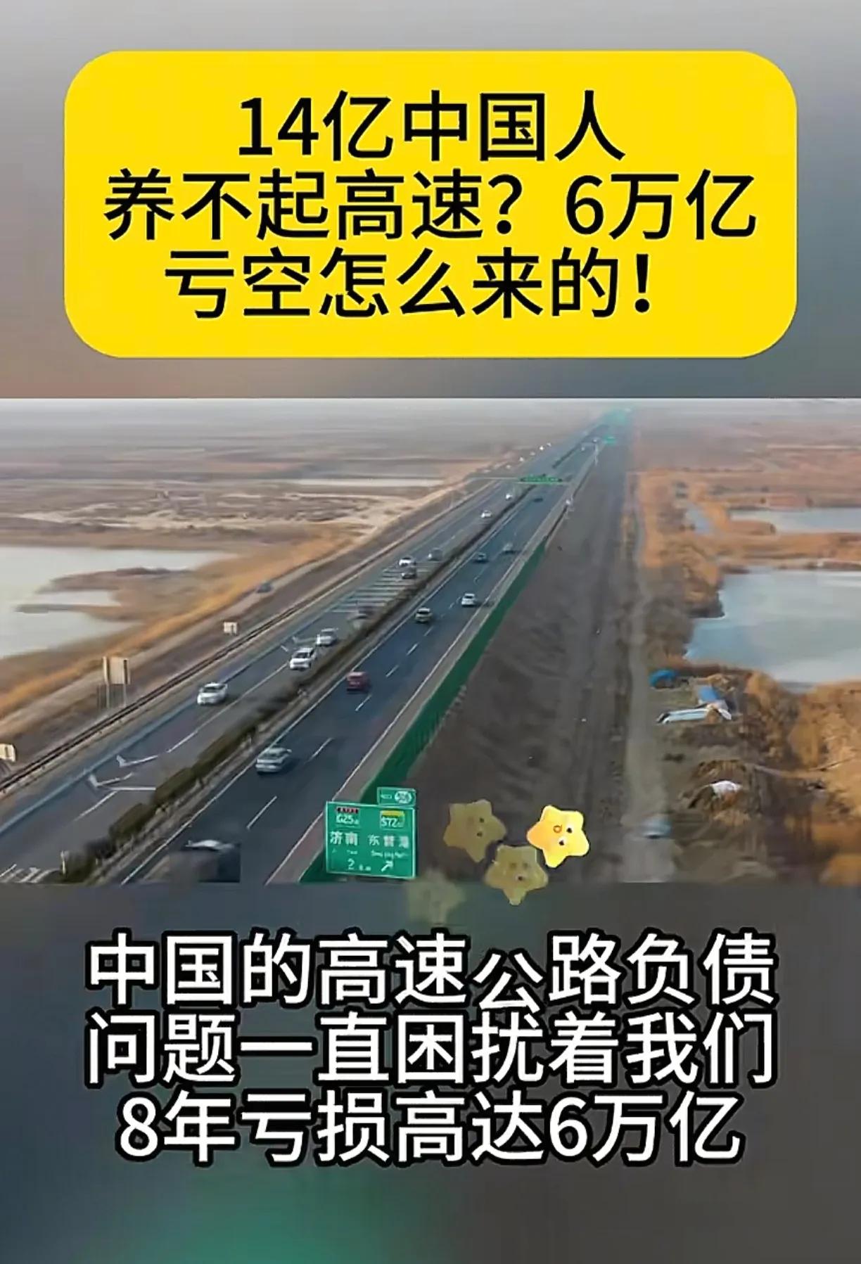 粗略的查了一下,目前全国大概有4亿多辆汽车,这么多车竟然还养不起高速。美国高速基本上免费,人家还赚钱。反观我国,8年里,高速不仅没有挣到钱,还累计亏损达6万亿。这不得不让人怀疑,钱都跑哪去了。每次上高速过路费也没少交啊。 更让人不解的是,缺钱吧,还总是做老好人,老爱搞援建。看到一视频说某建设公司竟然掏36亿给非洲盖房子[泪奔]。啥时候能对自己人好点啊。先把自己的日子过好,再去帮别人不更好吗。