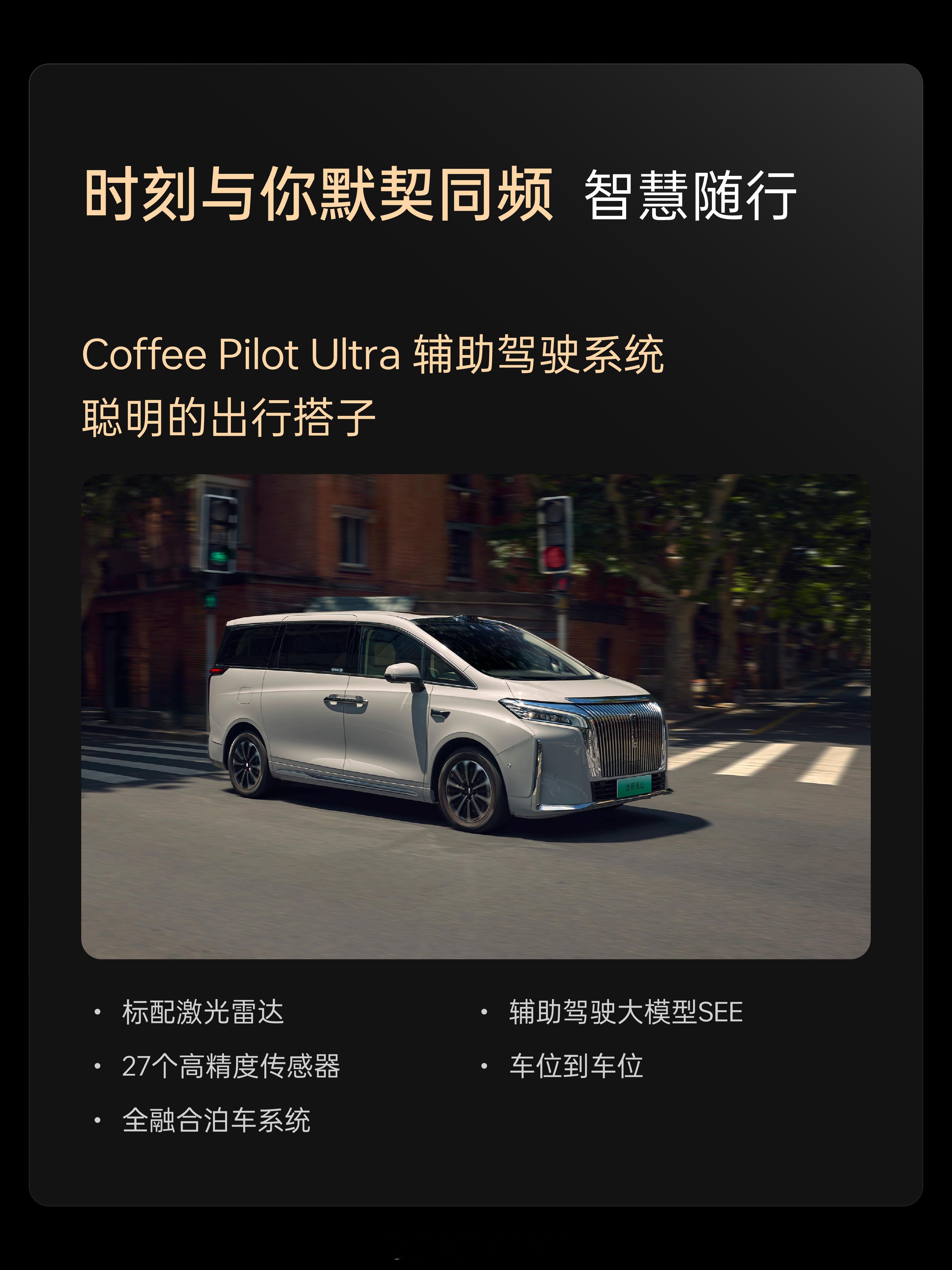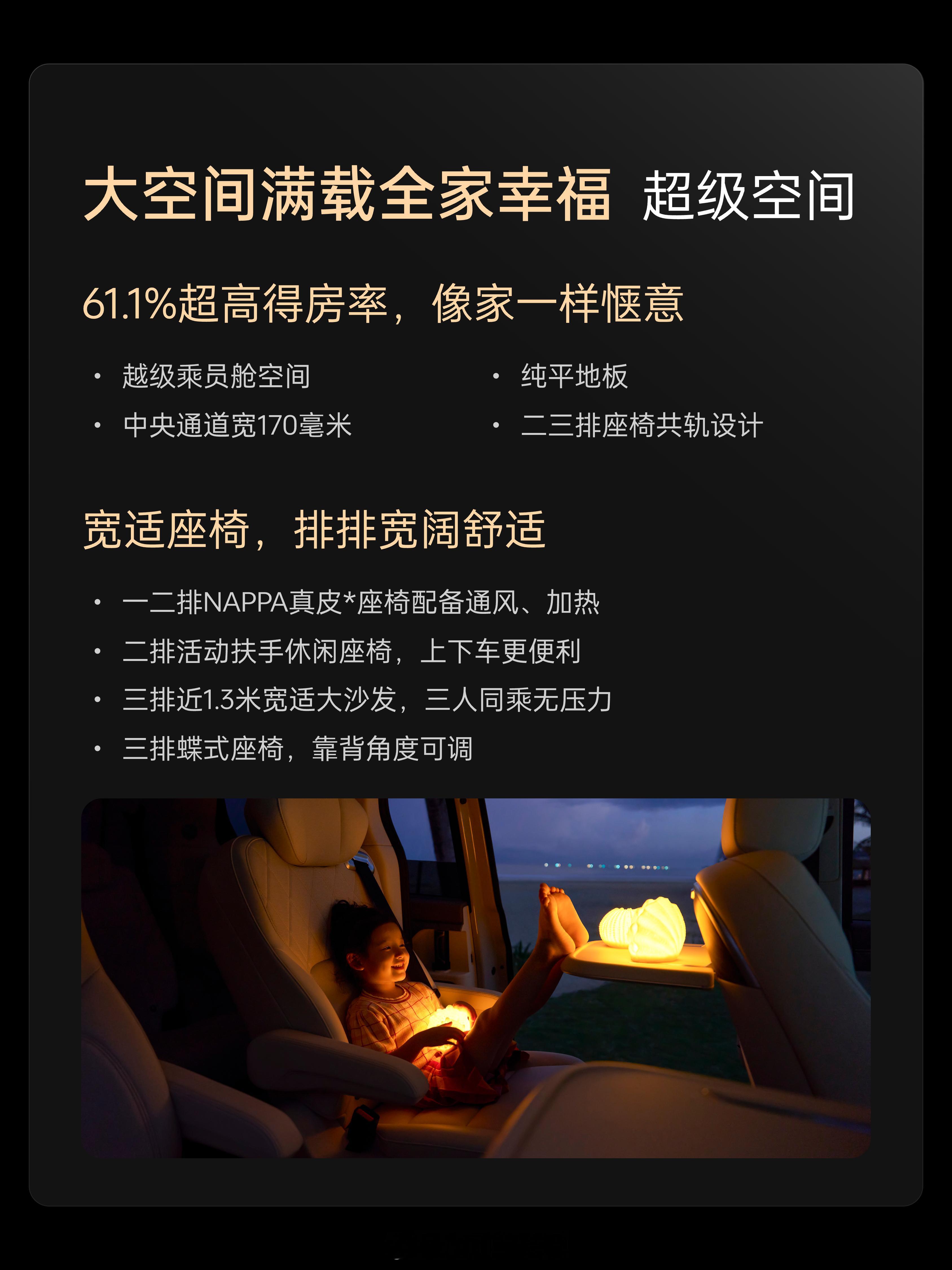 定位中大型MPV,2+2+3的7座布局,后排可选零重力座椅,还有17.3英寸后排娱乐屏,12.5升的车载压缩机冰箱,标配Coffee Pilot Ultra辅助驾驶系统,车内双15.6英寸屏+Coffee OS 3智能操作系统,8295P座舱芯片。