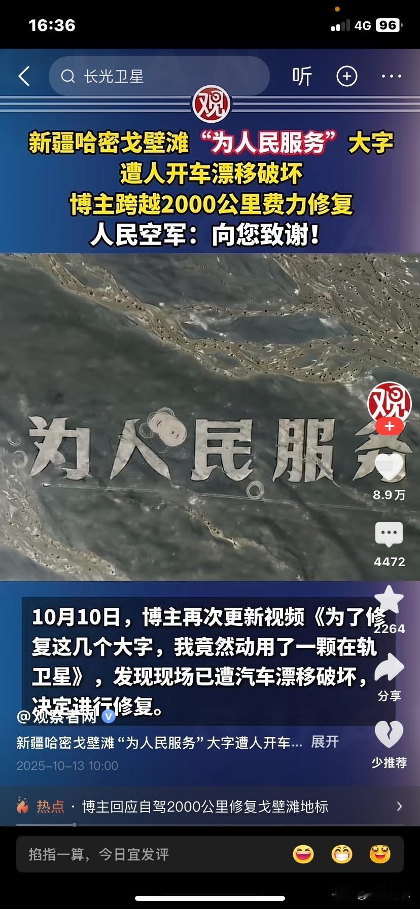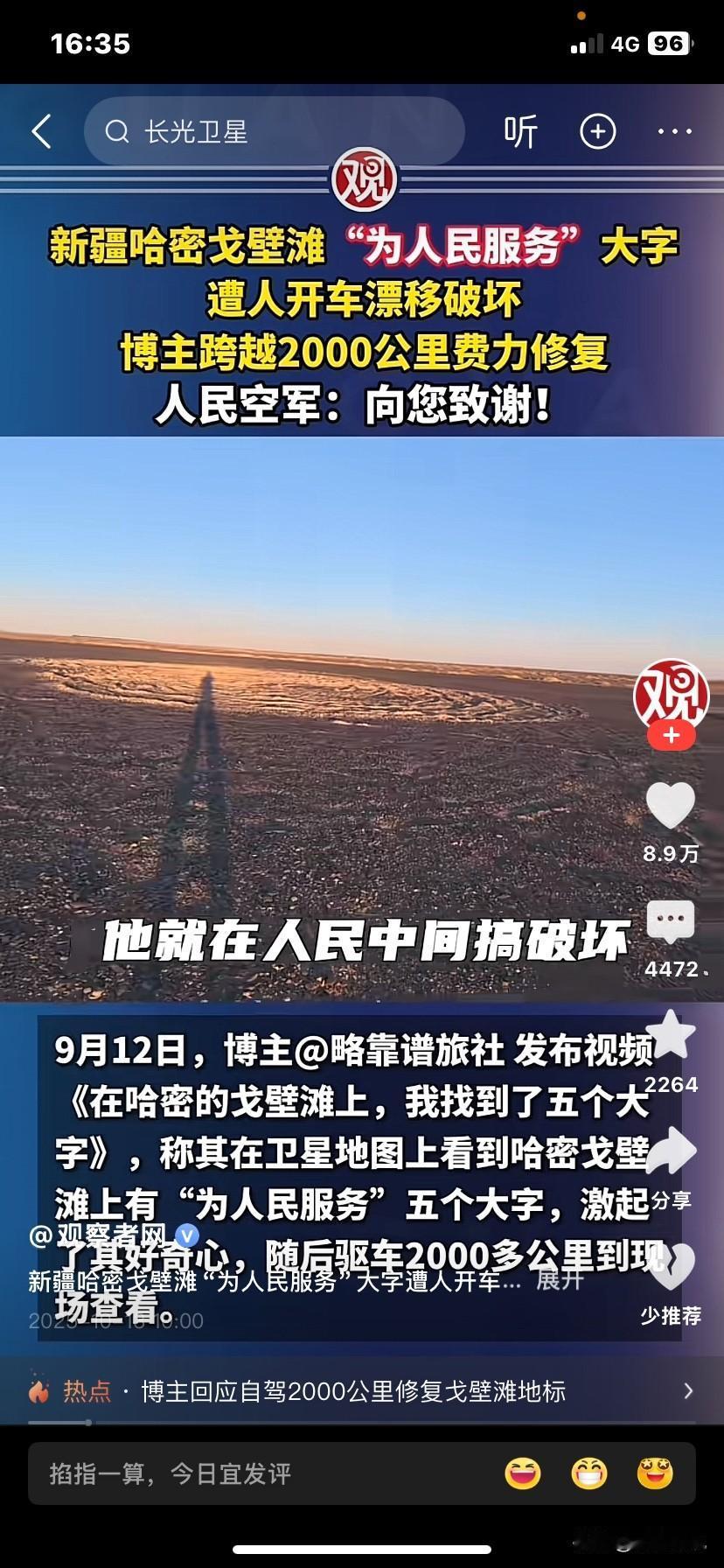 破坏者应当受到法律惩处。他是我国人民团结的象征,他是凝聚我们的力量。这是一万年都不会过时的话! 据说,这是60年代,附近一个军用机场为飞行员做导航用的,因为周边太空旷,没有参照物,当时领导就想出了在戈壁滩做大幅标语为归航的飞行员指引机场的具体位置。 标语不止这一条,周边十几公里范围内大约还有四五条,内容有共产党万岁,毛主席万岁等,现在机场已经弃用,只剩标语在戈壁滩。据说从卫星地图上可以搜到,地点大约在新疆东部。是谁破坏了法治