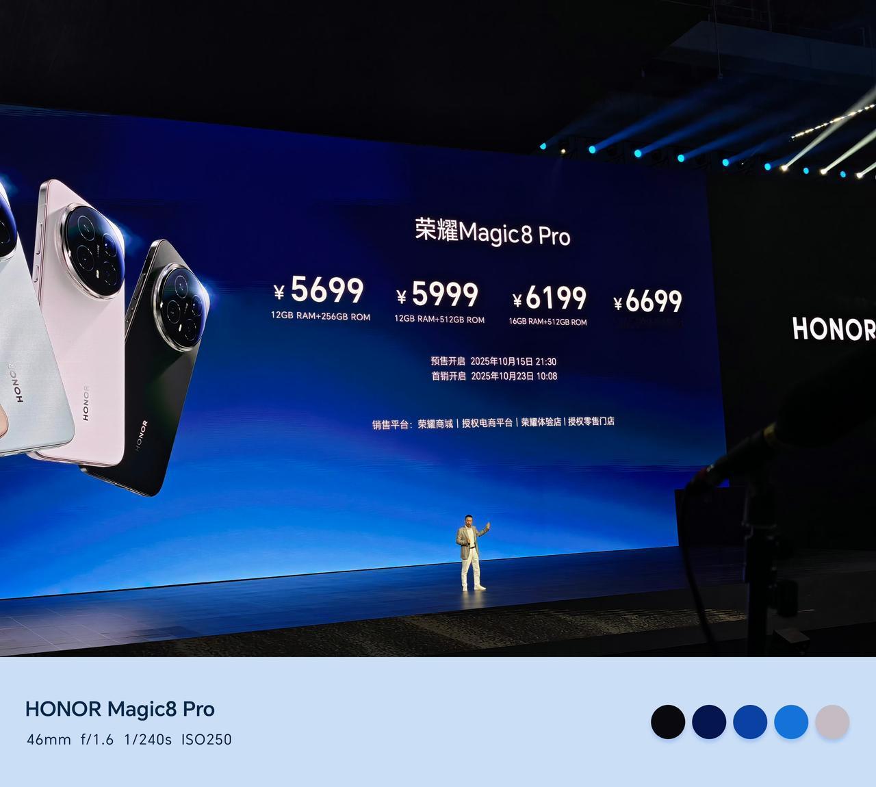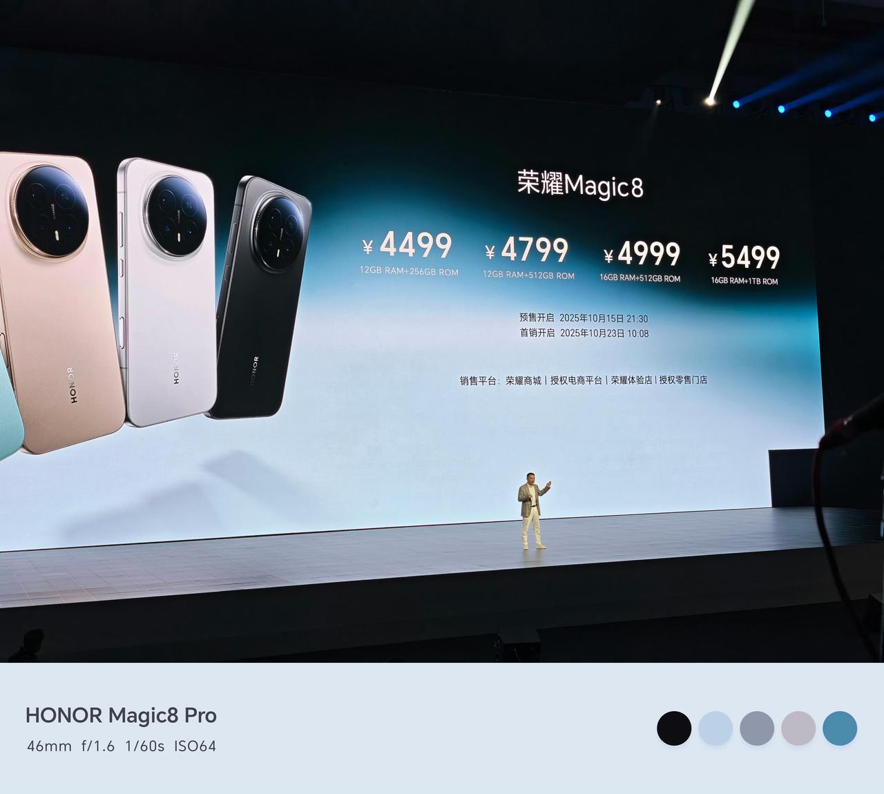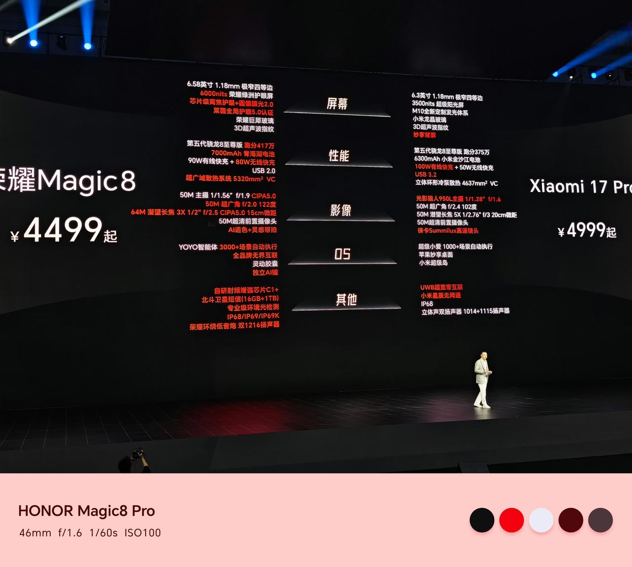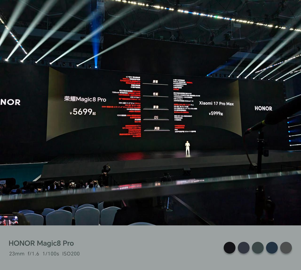 看完荣耀发布会,发现是我唐突了。给雷军整不会了,4499起步,声称全方位碾压米17PM[捂脸],简单总结价格/配置 荣耀Magic8, 12G+256G —— 4499元 12G+512G —— 4799元 16G+512G —— 4999元 16G+1TB —— 5499元(卫通版) - 宽74.03mm/厚7.95mm;205克 - 搭载骁龙8 Elite Gen5丨荣耀C1+ 射频增强芯片丨荣耀E2 能效增强芯片 屏幕📱 6.58英寸 OLED 直屏丨分辨率2760×1256 / 120Hz LTPO丨4320Hz PWM 丨 全局峰值1800nit 影像📷: - 50MP 1/1.56型 OIS 主摄(F/1.9) - 50MP 超广角 (F/2.0) - 64MP 1/2型 OIS 潜望长焦(光圈F2.5) - 前置 50MP 其他配置: -7000mAh+90W有线+80W无线丨无线反充 - 超声波屏下指纹解锁丨1216立体双扬丨支持IP68 / 69 / 69K ◆ 荣耀Magic8 Pro 12G+256G —— 5699元 12G+512G —— 5999元 16G+512G —— 6199元 16G+1TB —— 6699元(卫通版) - 宽75mm/厚8.32mm;219克 - 骁龙8 Elite Gen5丨荣耀C1+ 射频增强芯片丨荣耀E2 能效增强芯片 屏幕📱: 6.71英寸 OLED 等深四曲屏丨分辨率2808×1256 丨120Hz LTPO丨4320Hz PWM丨全局峰值1800nit 影像📷: - 50MP 1/1.3型 OIS 主摄(光圈F1.6) - 50MP 超广角 - 200MP 1/1.4型 OIS 潜望长焦(85mm;F2.6) - 前置 50MP 其他配置: - 7200mAh+120W有线+80W无线丨无线反充 -3D ToF面部识别+超声波指纹 - 1216立体声双扬声器丨支持IP68 / IP69 / 69K 怎么说呢,荣耀AI确实很强,YOYO单拎出来对比碾压小爱没毛病,但是全方位碾压是怎么回事儿[捂脸]荣耀Magic8 Pro的2亿像素潜望长焦很出众,10倍光学变焦,无论夜景还是防抖,都会比米17Pro强,这无可否认,毕竟硬件更好。 但是发布会对比把很多东西都标红了,稍微有点绷不住[捂脸]不过回头想想,你看荣耀都已经开始对标小米17Pro系列了,这不是变相在承认小米的确牛批么[狗头] 当然了,网络质量、通信也都是荣耀Magic8系的卖点,的确也不比小米差,甚至上了信号增强芯片,的确强。搭配上能吃目前国补,Magic8 Pro其实5400就能到手,还是挺香的~大家觉得呢?