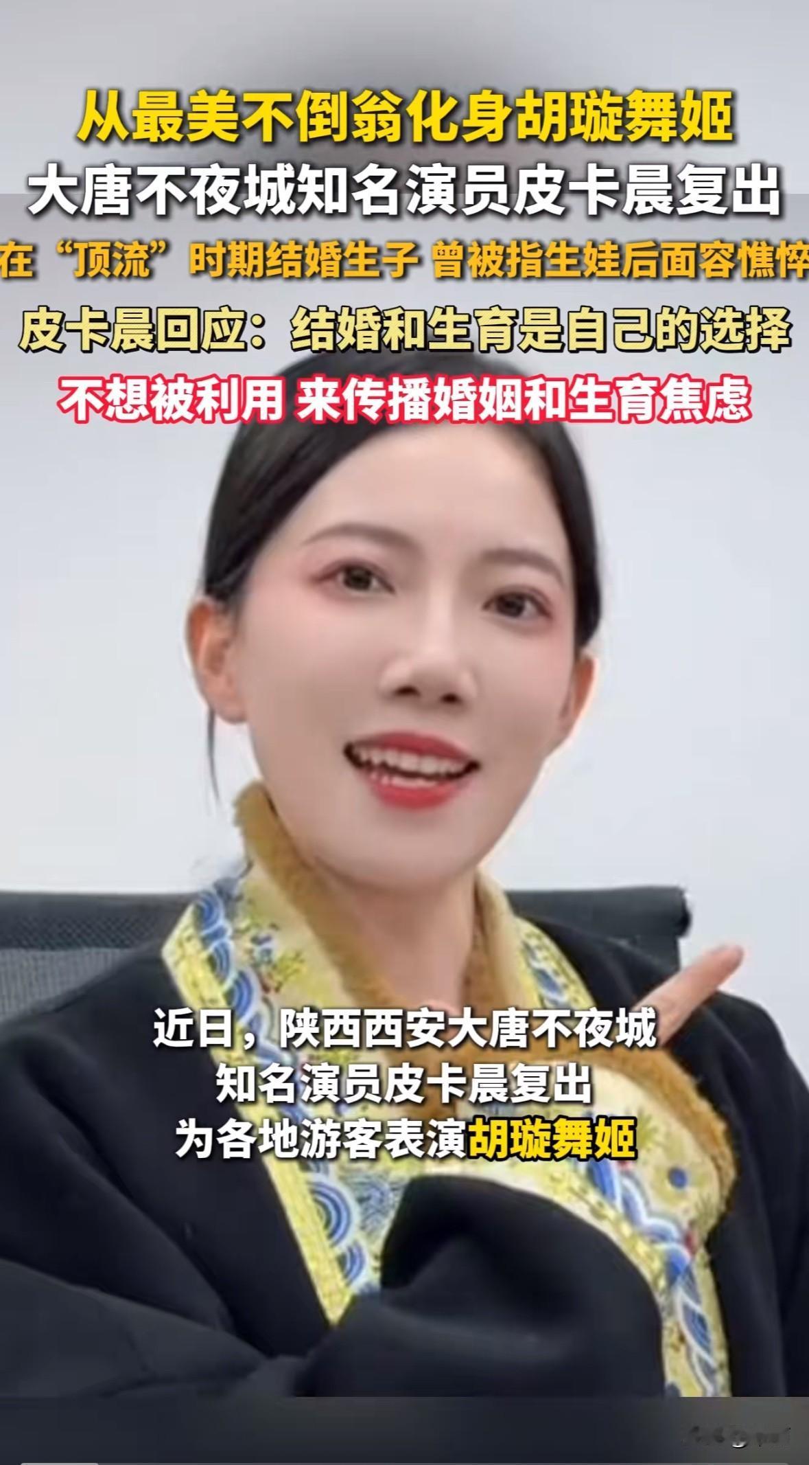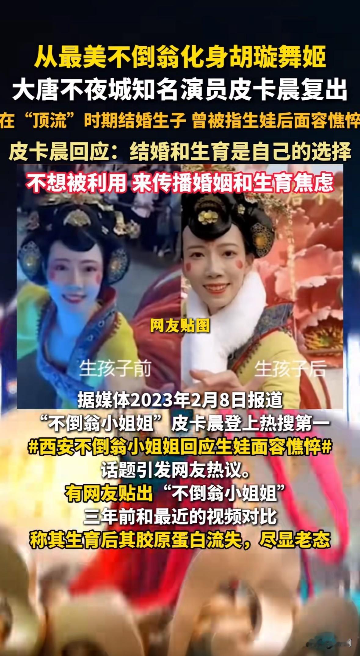 西安大唐不夜城的皮卡晨复出了,现在演胡旋舞姬,不是以前的不倒翁了。 她本名叫冯佳晨,2019年靠“大唐女子绝美牵手”视频火的,不倒翁上轻摇团扇的样子让好多人跑去西安。后来结婚生子,就暂时不表演了。 这次复出在开元广场北侧演出,每天19:20、20:20、21:20各演5分钟。为了新角色她泡在练功房练旋转,连动作细节都反复磨。 网友反应挺不一样,有人喊“爷青回”专门去打卡,也有人讨论她颜值变了。其实四年过去有变化很正常,她还回应过别拿生育制造焦虑。 流量时代很多网红昙花一现,她沉淀后带着新表演回来挺难得。大家喜欢的不只是她的样子,更是她身上的大唐韵味和对热爱的较真。