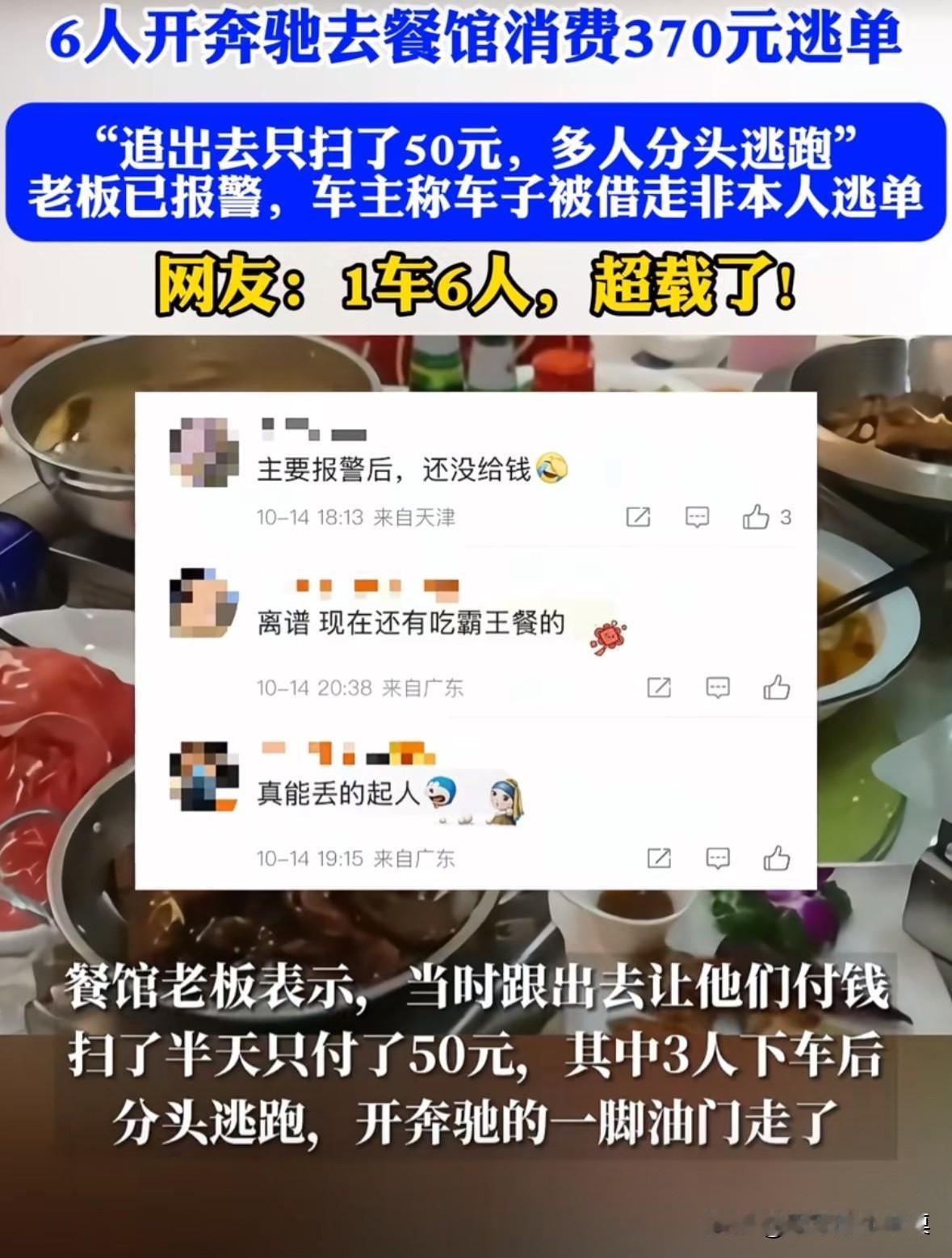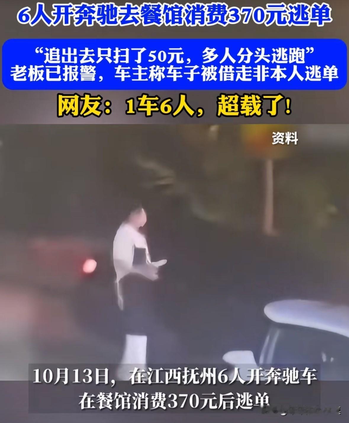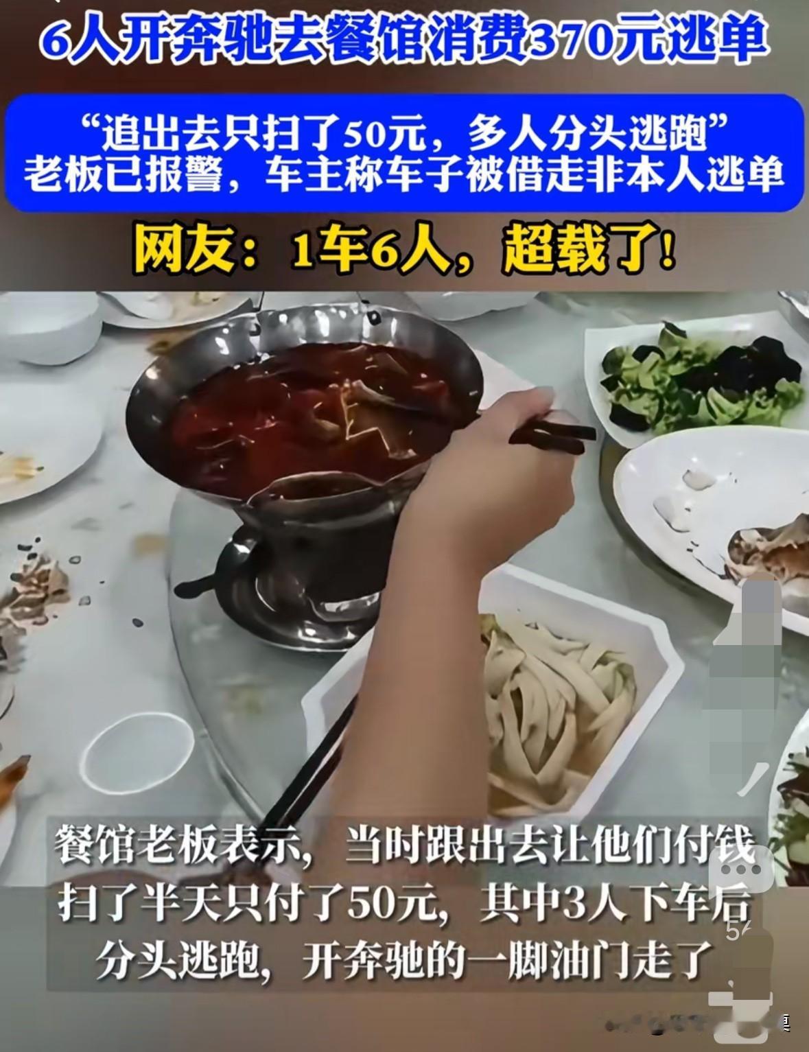 江西抚州一家餐馆内,有六个顾客开着奔驰车的来吃饭,一共消费了370元,不知道是没钱还是故意找刺激,居然选择逃单。 一开始老板没有注意,几个人扫码付款后,老板才发现他们几个就付了50元,老板追出去后,他们四散逃跑! 老板调监控,联系到奔驰车主,奔驰车主却说,不是自己开的车,车被借出去了! 报警吧,让警察处理! 按道理来说,都开奔驰了,不应该交这么上不了台面的朋友啊。