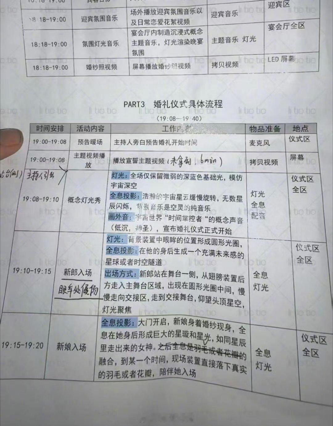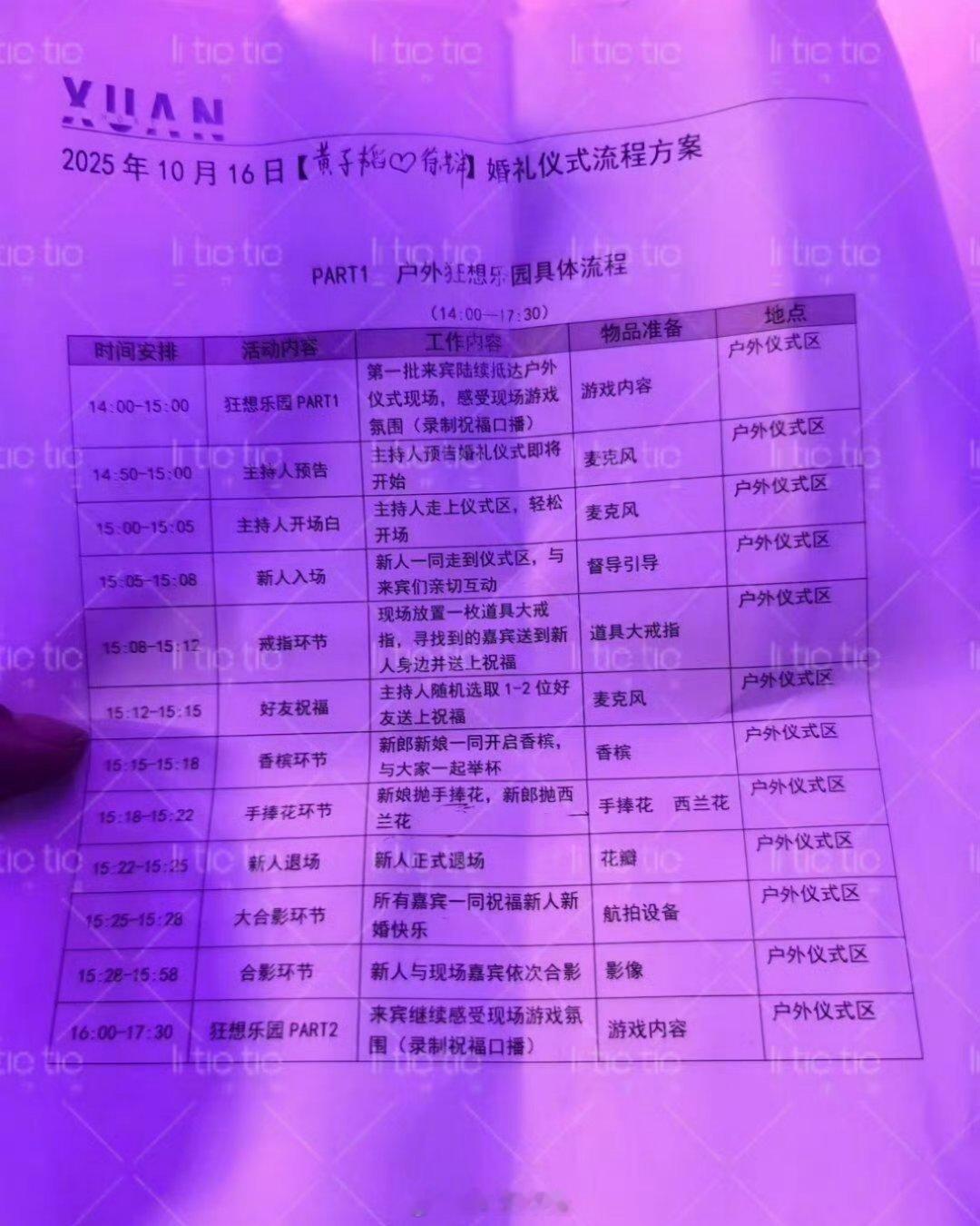 有网友晒出来了黄子韬跟徐艺洋的婚礼流程表,真的是很梦幻的婚礼即视感啊,黄子韬是真