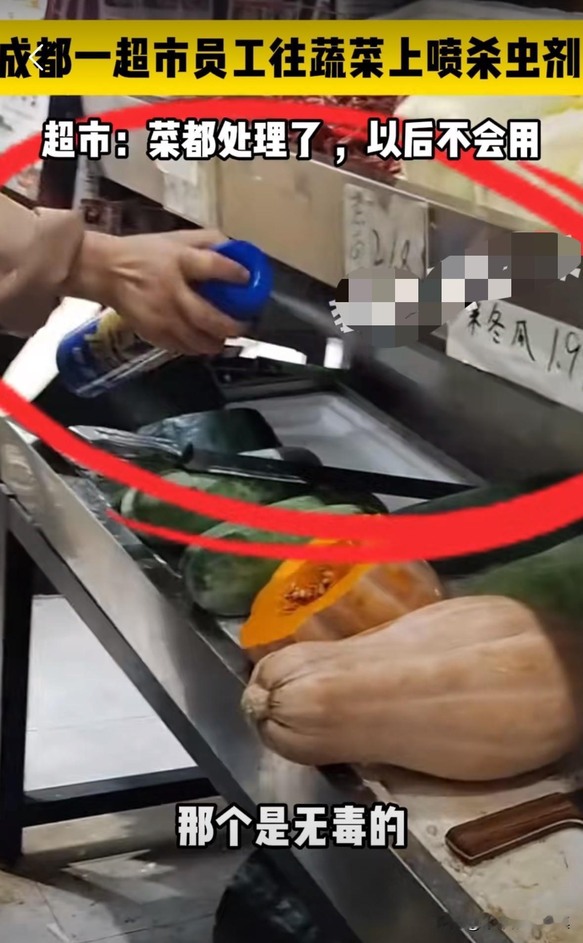成都一个超市里,店员往蔬菜上喷杀虫剂! 确实这样蔬菜上不会有虫子了,但是如果吃死人了怎么办? 事后,超市的工作人员说:“那个是无毒的,轻微的杀虫剂,那些喷过杀虫剂的菜,我都让他们扔掉了,不能再买了!” 现在倒是处理了,也不能保证以前没用过啊。 如果不是超市里领导允许的,店员会自己买一瓶杀虫剂来喷吗! 这些菜都是买回去现吃的,如果真吃出问题,你们脱不了关系。