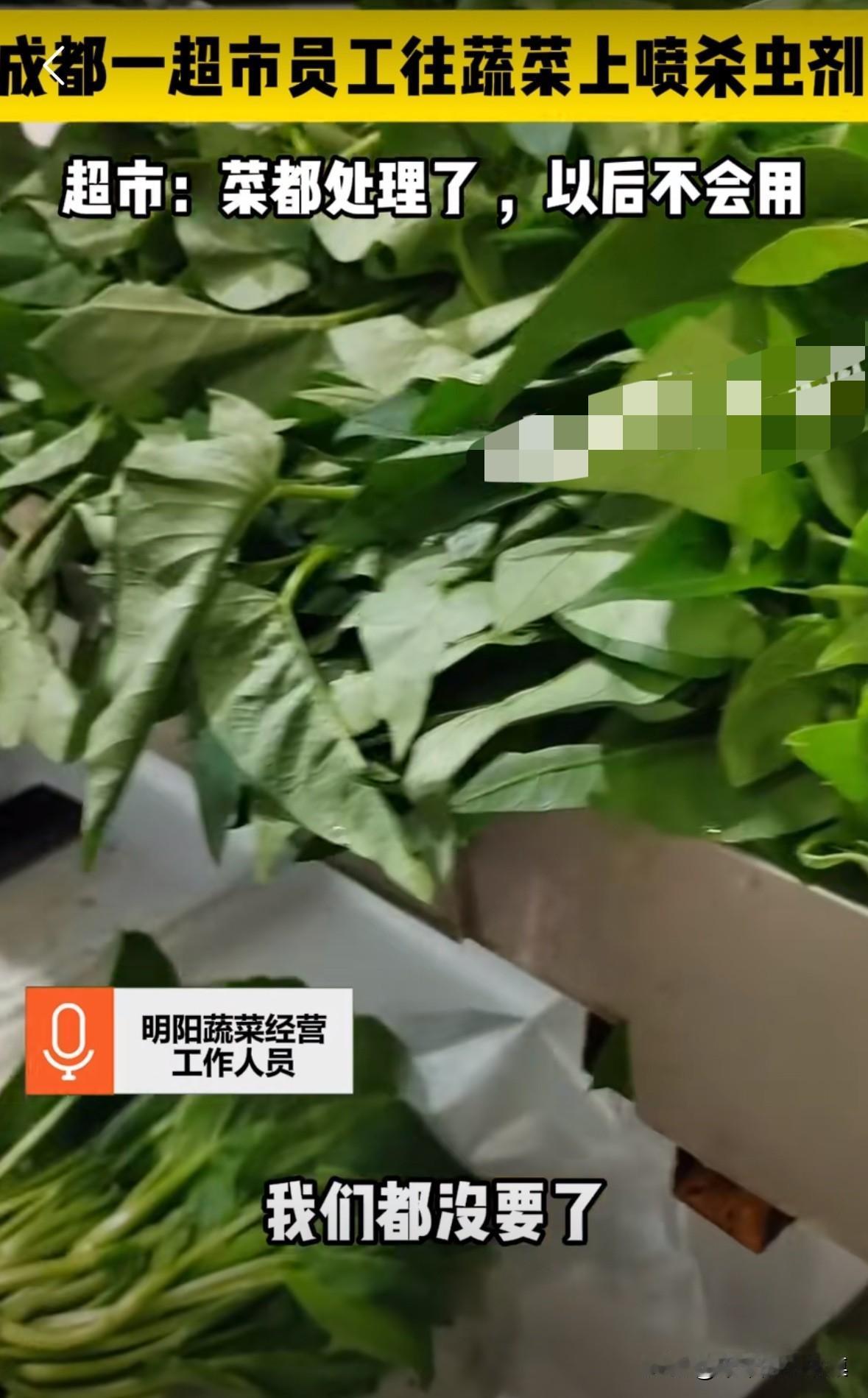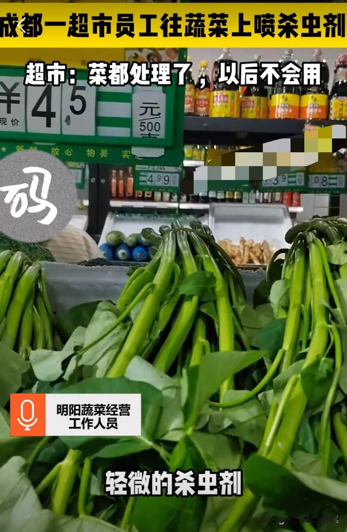成都一个超市里,店员往蔬菜上喷杀虫剂! 确实这样蔬菜上不会有虫子了,但是如果吃死