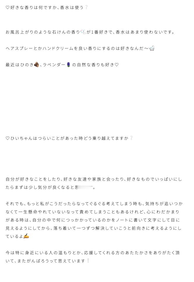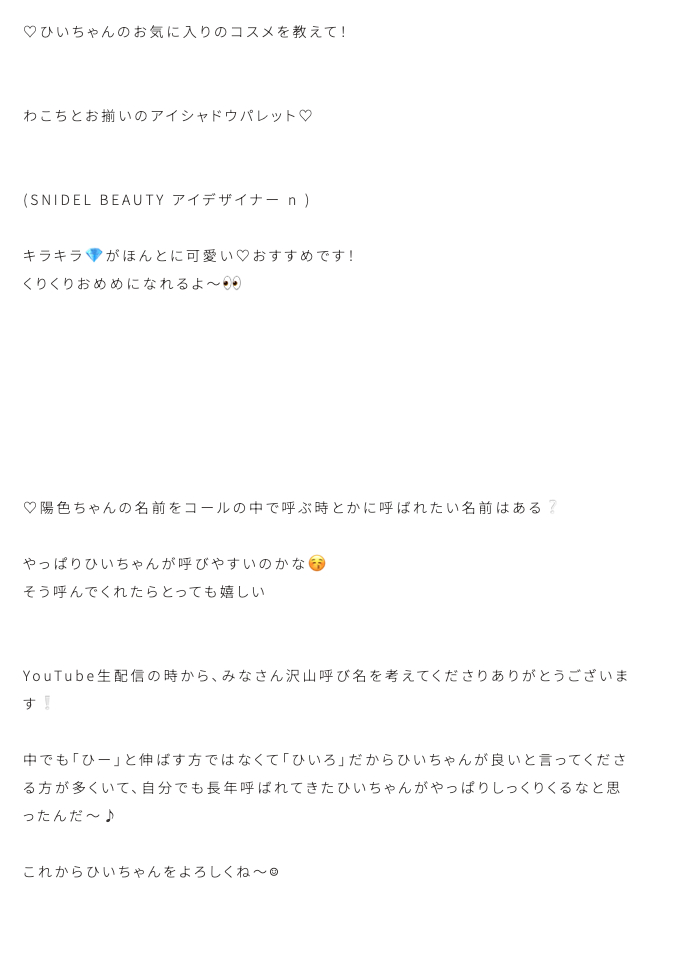 目黒陽色「わたしは手を顔の前でなにかと動かすことがクセみたいで、手を振るときとか別れ際にあごの前でよくばいばい👋するよね〜!とその仕草がひいろらしいと言われて、あれ、?もしかしてその光景みなさんもどこかで見たことありますか❔そんなことを意識して写真に撮ってもらった手をよく見るとなんだか手が小さいことにも気がついて、四期で手の大きさ比べをしてみましたが、ちいたんと1、2位を争う手の小ささにおどろきました❕身長のわりに手は小さめだったことはこれからチャームポイントにしてみようかなと思います♪」