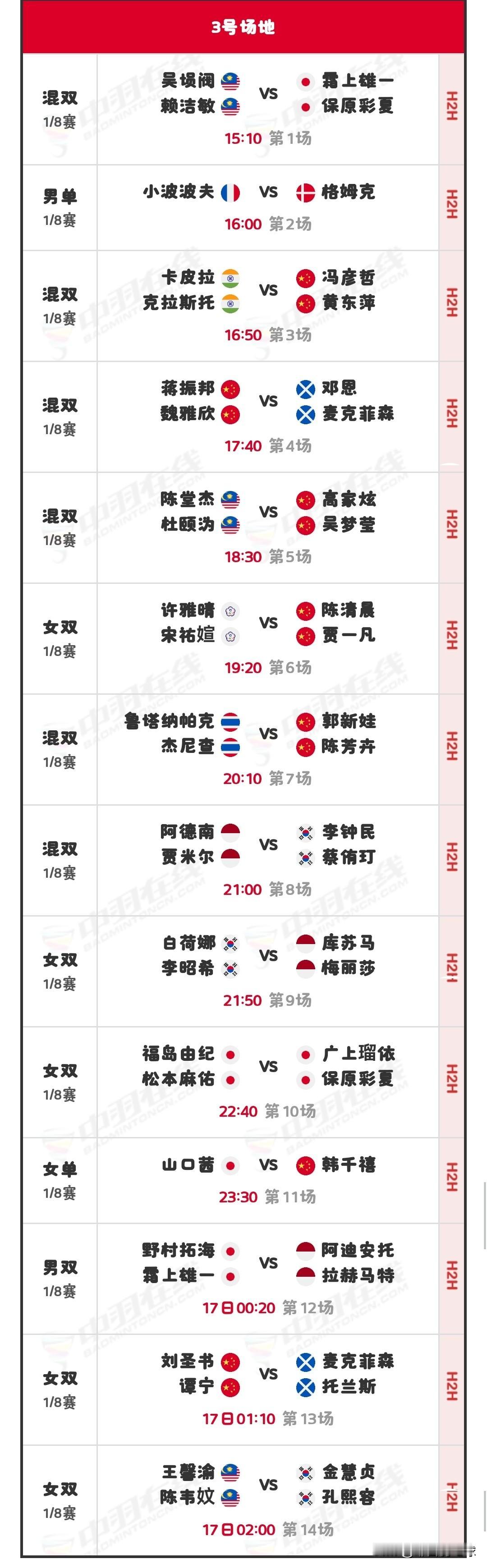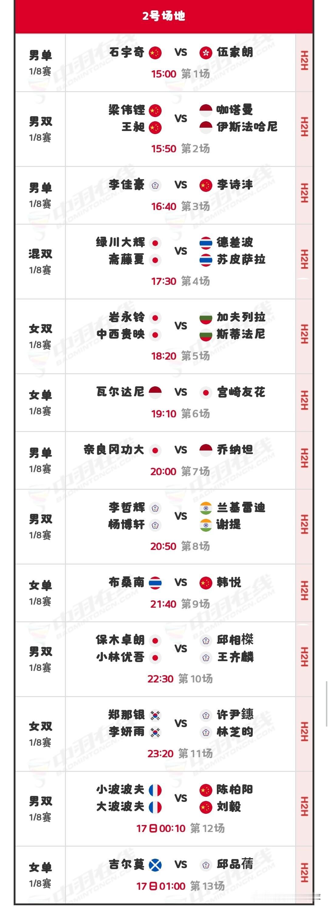 10月16日丹麦羽毛球公开赛1/8决赛安排 昨日,国羽在比赛中斩获10胜2负的佳绩。不过,陆光祖历经三局鏖战,终被昆拉武特击败;李怡婧/罗徐敏同样激战三局,遭省队许尹鏸/林芝昀逆转淘汰。他们皆止步首轮,遭遇一轮游。 历经两天的激烈角逐,首轮1/16决赛已全部收官,国羽共计取得15胜6负1退赛的成绩。 今日进行1/8决赛,将于北京时间15:00开启,共有三块场地同时进行赛事。对阵情况为:石宇奇对阵伍家朗,李诗沣对阵李佳豪,翁泓阳迎战拉尼尔,陈雨菲对阵米娅,韩千禧挑战山口茜,梁王组合对战印尼组合。详细对阵安排如下: 国羽赛程 国羽决赛名单 羽毛球 羽毛球爱好者 羽毛球比赛 国羽 国羽加油 石宇奇 陈雨菲