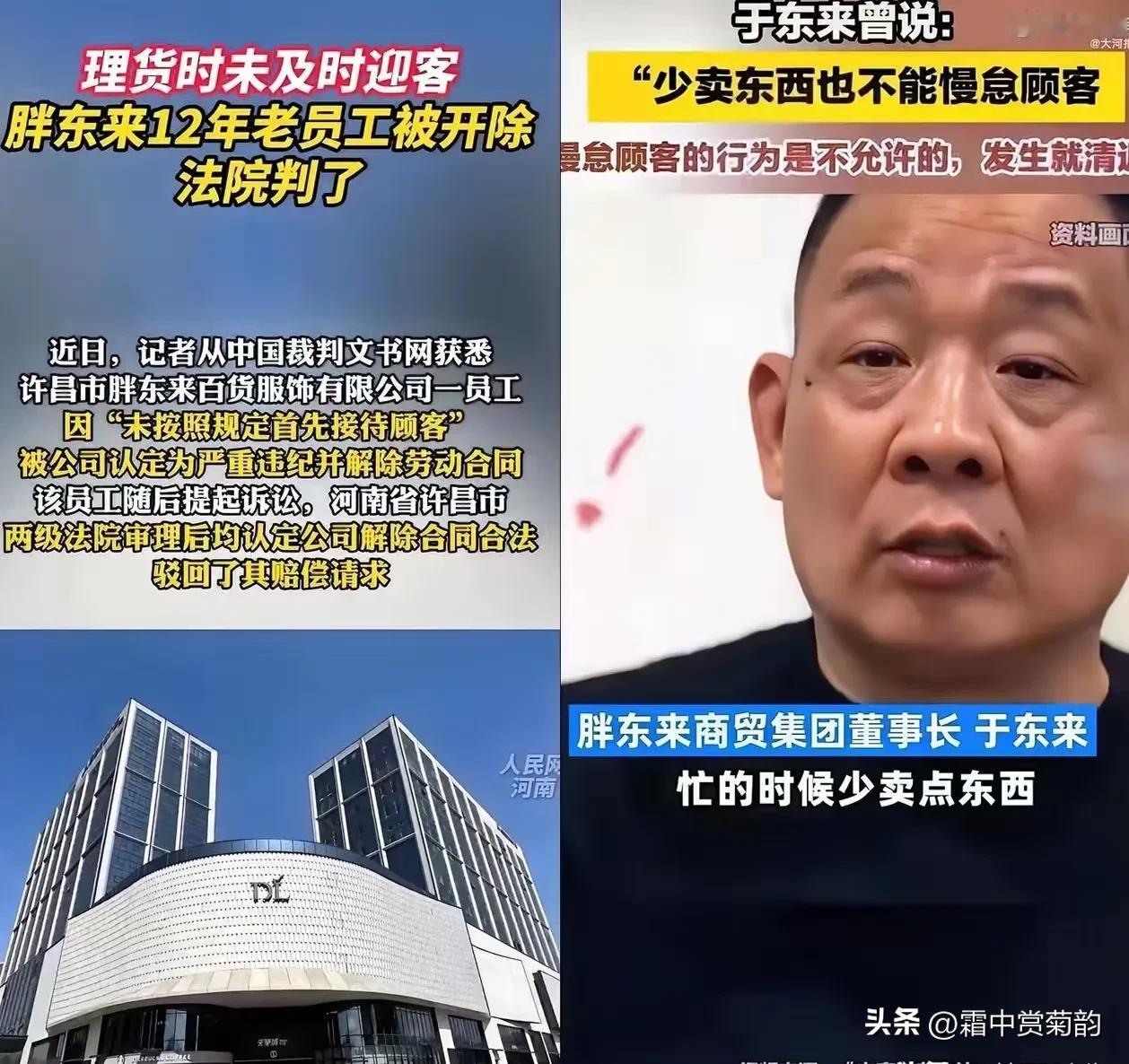 这下,胖东来9000多名员工估计要失眠了 因为这几天发生了一件让员工议论纷纷的事。一名工龄12年的老员工,因为没有及时接待顾客,被公司认定严重违纪,并被解除劳动合同。 后来,员工提起诉讼,现在法院的判决下来,驳回原告的诉求。判定公司解除劳动合同合法,驳回原告的赔偿要求。 其余的同事都坐不住了,纷纷讨论这个事情。特别是年轻员工,私下里说,今后接待顾客的时候,生怕自己稍微慢一点,就会被开除。 大家都明白东来哥重视顾客服务的初衷,但这样的处理方式,不由让人觉得有点过于严厉了。 对此,你有什么看法,欢迎在评论区讨论