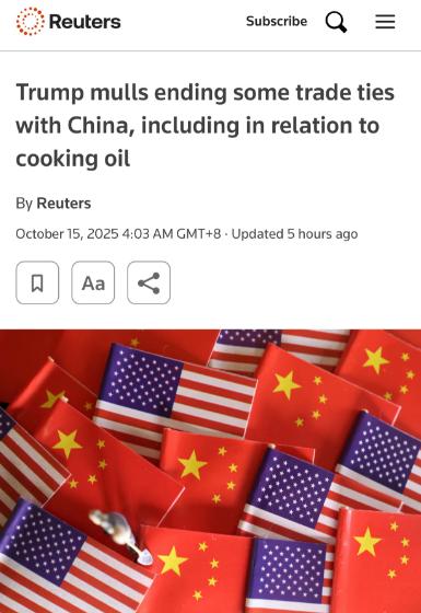 路透社:特朗普威胁终止部分中美贸易关系 路透华盛顿10月14日电-:美国总统唐纳德·特朗普周二表示,华盛顿方面正在考虑终止与中国的一些贸易关系,包括与食用油相关的贸易关系。 看似是对着中国挥拳,实则第一拳先砸在了美国自己的饭碗上。中美所谓的“食用油相关贸易”,核心根本不是瓶装油的买卖,而是大豆贸易。 美国90%以上的大豆都用来榨油,2024年美国大豆出口总额有245.8亿美元,占了农产品出口的14%,这里面中国就买走了一半多,花了126.4亿美元,光运到中国的大豆就有近2700万吨。 特朗普敢拿这个开刀,说白了是掐准了2025年选举的节点,想靠“对华强硬”的姿态稳住农业州的票仓,毕竟这些种大豆的农民曾是他的核心支持者。 可现实早给这出戏拆了台。就在他放话的前几天,美国农业部的数据已经摆得明明白白,2025年1到7月,美国对华大豆出口量只剩590万吨,比去年同期暴跌39%,出口额直接腰斩到25亿美元。 伊利诺伊州有个农场主叫瑞恩・弗里德斯,他说得特别实在,现在把大豆卖出去,每英亩得亏64美元,剩下的只能堆在粮仓里发霉。 更连锁的反应已经蔓延开了,有个农机制造商叫CNH,他们农业业务的销售额跌了20%,CEO急着喊话,说“只有中国重新下单才有好消息”,毕竟从播种机到仓储物流,整个美国农业产业链都绑在对华出口上。 特朗普想靠救助填这个窟窿,可这招根本就是自欺欺人。他说要从关税收入里拿出超过100亿美元补贴农民,可这笔钱本质上是美国纳税人的血汗钱,2025财年美国有2150亿美元的关税收入,最后全转嫁到消费者身上了。 更讽刺的是,除了农民,其他被关税砸中的行业根本没人管,加州的葡萄酒出口跌了30%,威斯康星州的啤酒厂因为铝罐、大麦涨价,成本飙升了40%,老板只能关门大吉,这些人可没拿到一分钱救助。 这种“选择性救市”早就暴露了本质,所谓的“贸易保护”不过是拿整个美国经济当赌注的政治游戏而已。 反观中国这边,早就不是10年前那个只能被动应对的样子了。虽然2023到2024年度,我国食用油自给率只有34.2%,低于国际安全线,三分之二的供应都得靠进口,但这几年我们早布好了局。 2018年贸易战那回我们就试过水,当时中国对美国大豆加征关税,结果国内豆油价格压根没乱,因为我们早把进口渠道铺到了巴西、阿根廷,还从加拿大进菜籽、从印尼进棕榈油,早就形成了多元化的供应网。 现在我们更有了技术硬底气,益海嘉里金龙鱼搞出了稻米油技术,把以前浪费的米糠变成了宝贝,我国每年产2亿吨水稻,能出1600万吨米糠,从这些米糠里榨出的油,相当于1300万吨大豆的量,等于凭空多了1.1亿亩大豆的产量,这可是不跟粮食争地的战略补充。 这种“藏粮于技”的路子,让中国在食用油供应上的腰杆越来越硬了。 更关键的是,中美贸易从来不是只有美国依赖中国,而是双方的。2024年美国51.7%的大豆、29.7%的棉花都得卖到中国,他们对华出口的增速比全球增速高了好几倍,中国早就成了美国农产品的“命脉市场”。 可中国对美国的进口依赖度远没那么高,就拿大豆来说,巴西早就成了我们最大的进口来源国,就算少从美国买,也有的是地方补上这个份额。 特朗普嘴上喊着“终止贸易”,心里比谁都清楚,真要是断了,美国豆农的粮仓里大豆得堆成山,农业州的选票也得飞走,可中国顶多换个卖家,根本伤不到根本。 这事儿说到底,就是特朗普把经贸关系当成了竞选的道具,可贸易的本质是双方互利,不是用来搞政治的筹码。2018年的贸易战已经证明了,加税救不了美国农业,只会让农民吃亏、让消费者买单;现在再拿食用油说事儿,不过是重复当年的闹剧罢了。 中国这边早就有准备了,有进口多元化撑着,还有技术突破补着,根本不怕这种威胁。倒是美国那些等着中国订单的农民该犯愁了,这出政治戏演完了,他们的大豆还能卖给谁?这种伤敌八百、自损一千的套路,说到底不过是自导自演的困局,根本成不了气候。