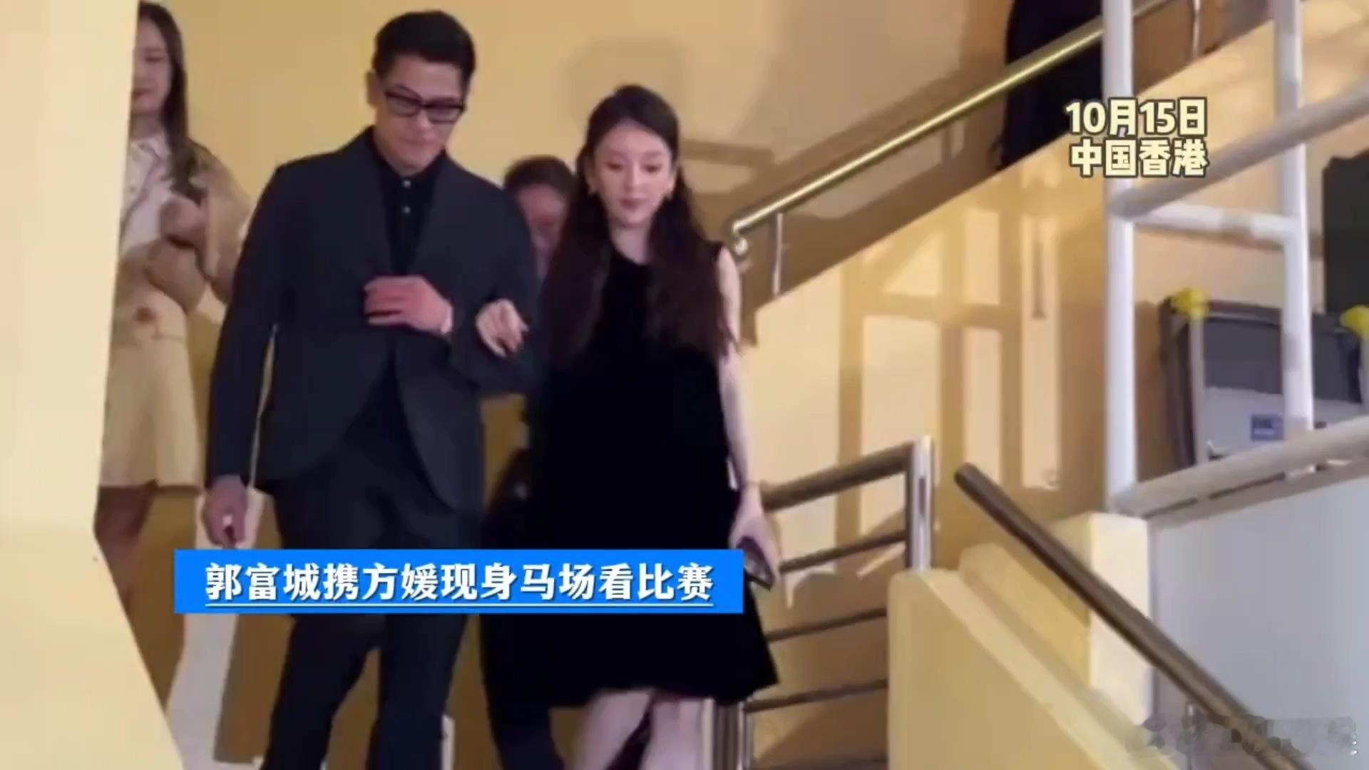 郭富城宣布三胎预产期在本月底方媛挺孕肚陪郭富城观看赛马 方媛看着不像孕晚期